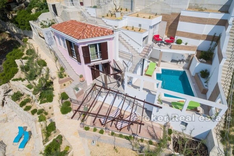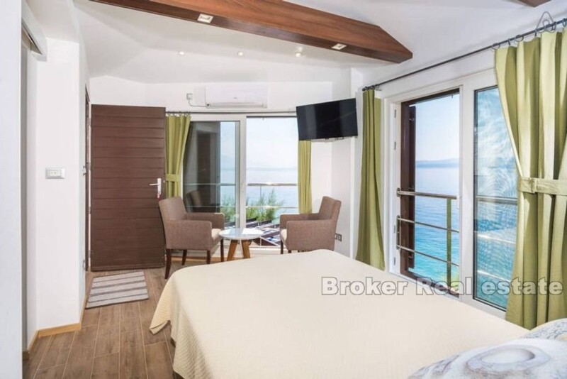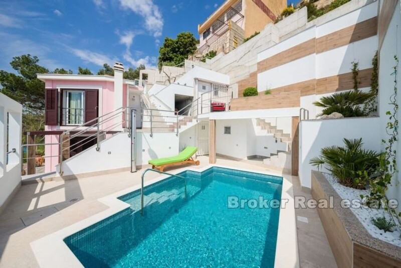 For sale is a beautiful property with a total living area of 275 m2 in a town near Omiš, built on a plot of land of 650 m2 in the first row to the sea. This specific property is located on a large slope with a wonderful view of the sea and islands and consists of a larger and a smaller house with a pool. The upper (larger) house has a total area of 225 m2 and consists of two separate two-story apartments: Apartment 1 has a total living area of 85 m2 + 15 m2 terrace and consists of a kitchen with dining room and living room, two bedrooms and two bathrooms. Apartment 2 has a total living area of 90 m2 + 35 m2 terrace and consists of a kitchen with dining room and living room, two bedrooms and a bathroom. The lower (new) house has 2 floors. The total living area of 50 m2 includes a kitchen, one bedroom and a bathroom. In front of the house there is a swimming pool from which you can enjoy a magnificent view of the sea and the islands. In addition to the pool, the exterior of the lower house includes a sunbathing area of 20 m2, there is also a gallery above the pool of 6 m2 and a barbecue area of 12 m2. All the outdoor areas surrounding the smaller house are about 120 m2. There is a possibility to build another house of 4 floors. The property has 3 parking spaces, and the property is 10 meters from the sea. The distance from the city center of Split is 25 km. It is an excellent opportunity for investment as well as for vacation in the summer months as it offers huge potential.