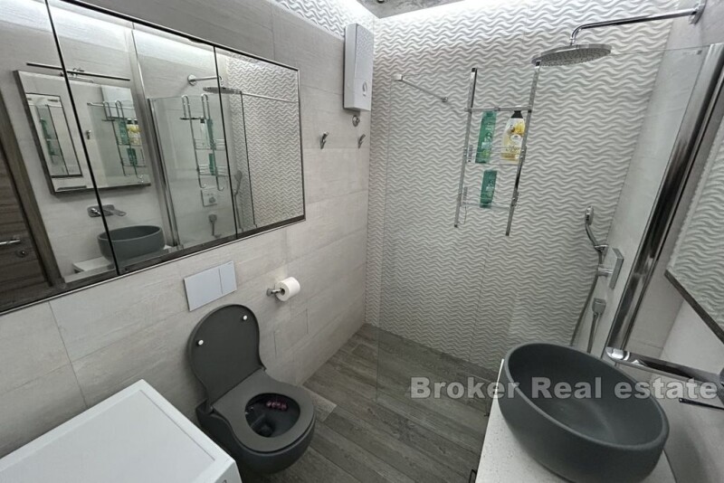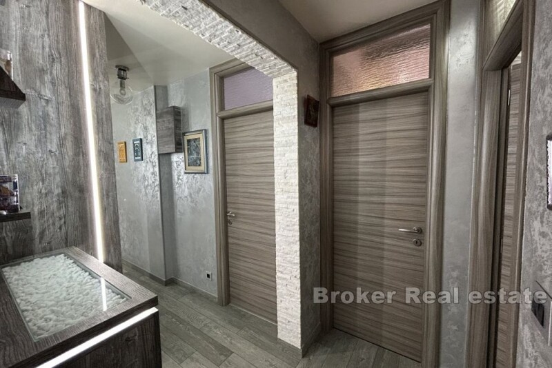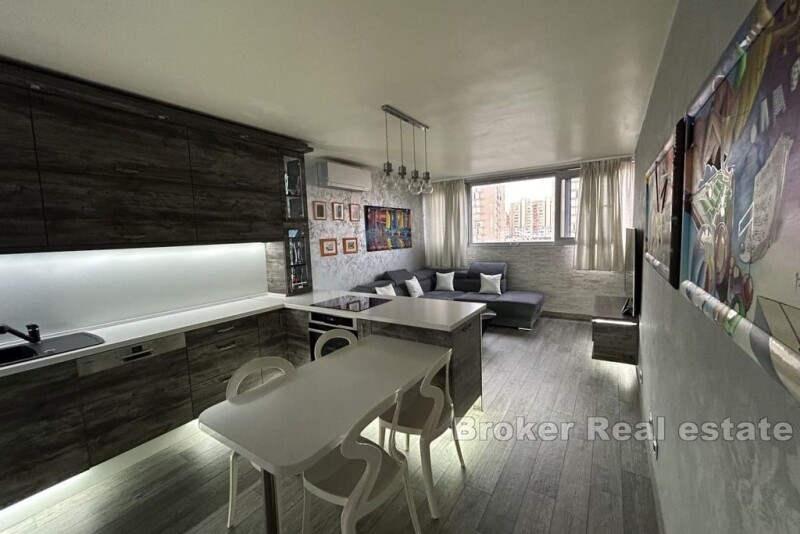 Fully furnished and equipped apartment for sale on the 3rd floor of a residential building in Split 3. The apartment has an area of 66 m2, oriented south-north, and consists of 2 rooms, one with a double bed, while the other is left to the buyer's choice as to what purpose he will give it, either as a bedroom or a study. The apartment consists of a kitchen with a dining room and a spacious living room in a unique space. The owners decorated the apartment by carefully choosing the furniture and numerous details in the space, paying special attention to the lighting. The apartment is for sale fully furnished and equipped. The location of the apartment is quiet, and there are shops, cafes, and a pharmacy nearby, and the beach can be reached on foot in 15 minutes. The bus station, school and kindergartens are in the immediate vicinity.