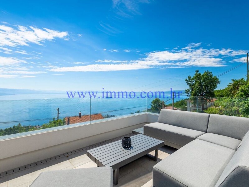EXCLUSIVE VILLA WITH PANORAMIC SEA VIEW A beautiful new villa for sale, located in a quiet location near Opatija, the "Pearl of the Adriatic". The villa is located on a slope, 1.4 km as the crow flies from the sea, with a beautiful panoramic view of the Kvarner Bay and the Opatija Riviera. The villa was built in 2022 with top-quality materials, has three floors connected by internal stairs, and its interior is elegantly and tastefully decorated. Heating and cooling is ensured by underfloor heating and fan coil units in each room. For complete privacy and peace of mind of future owners, this property has an alarm system and video surveillance with 5 cameras. The lower floor of the villa consists of a garage of 43 m2, a machine room, a laundry room and a gym. On the middle floor there are two bedrooms with bathrooms and a common terrace with a view of the sea. Also on this floor there is a studio apartment for guests with a separate entrance. The apartment consists of a living room with a kitchen, a bathroom and a terrace with a view of the sea. The upper floor consists of a spacious open living room with a kitchen and dining room and a master bedroom with a dressing room and a bathroom. An additional highlight of this beautiful villa is the spacious terrace overlooking the sea, which contains an exclusive outdoor living room with a 33 m² infinity pool and sunbathing area, an outdoor dining room with a fireplace-grill and a children's playground. In front of the villa there is a large parking lot for several cars. Additional information about the facility, its exact location and sightseeing is possible after signing a brokerage agreement with the agency that is in accordance with the Data Protection Act and the Real Estate Brokerage Act.