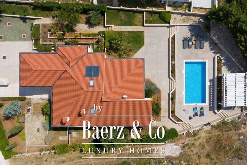 Harmonious, comfortable Mediterranean style villa, in an attractive location, surrounded by small residential buildings and family houses, with a beautiful sea view (1200 m as the crow flies from the sea or 10 min walk to the center), in a very quiet area. It was built on a plot of approx. 1400 m2 enriched with a landscaped Mediterranean garden, swimming pool with sun deck and Dalmatian barbecue and a terrace for dining and socializing. The property has approx. 350 m2 of living space, and was built in 2008 using high quality materials (wooden windows and shutters in the indigenous style of the highest quality larch wood, wooden floors made of succulent - wood characterized by high hardness, 21 cm construction - reinforced concrete, walls protherm 38 cm…) It consists of two floors: On the ground floor there is a garage, a large multipurpose room (living room, bathroom, boiler room and storage). Wooden stairs lead to the first floor where there is a laundry room with balcony, living room with kitchen and dining room and exit to the garden, then a small toilet and a gallery from which you enter the attic (room with wardrobes). On the first floor there is a bedroom consisting of three bedrooms (two double bedrooms and one children's room) and two bathrooms. All three rooms have a balcony overlooking the garden and the sea. The house is currently used for tourist purposes and can accommodate up to 10 people.