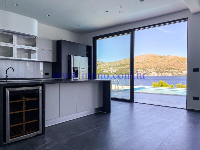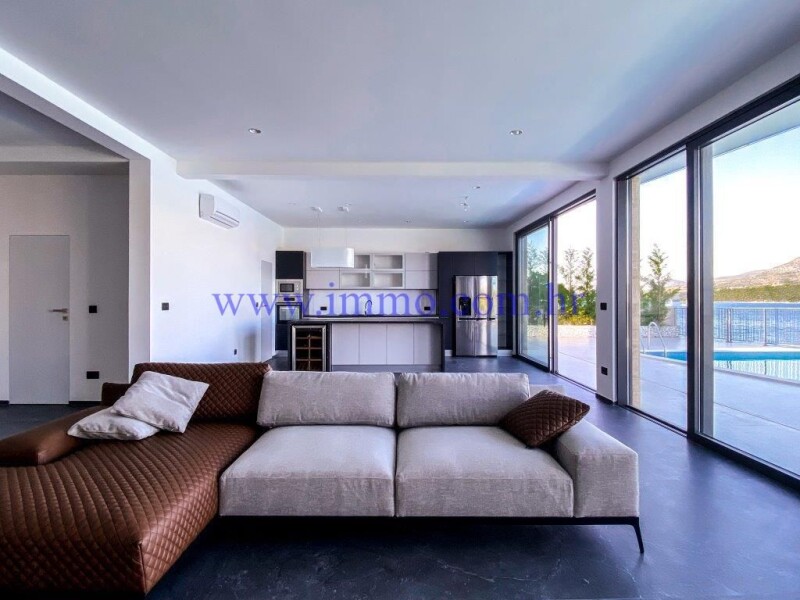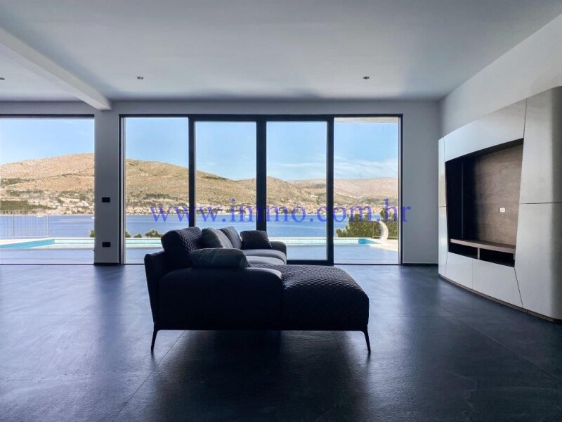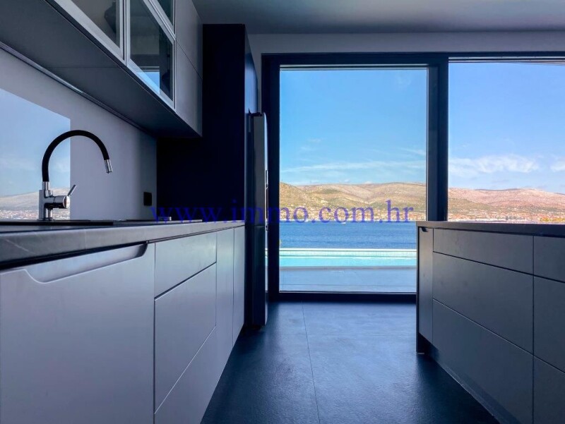 Six luxury villas for sale, situated in an attractive location on the northern side of the island of Čiovo, approx. 15 km from airport and close to all amenities. All villas are built to meet the highest standards with materials and equipment of highest quality. Villa 2 with an area of 349 m2 is located on a plot of land of 700 m2, first row to the sea. It extends over two floors and offers a beautiful view of the sea. Ground floor consists of entrance hall, open concept kitchen with kitchen island and dining room, spacious living room, two bedrooms with its own bathrooms, guest toilet and a pantry. One of bedrooms has its own dressing room and small living room. Access to open terrace with heated pool is possible through glass doors from living and dining room. First floor has three bedrooms with en suite bathrooms, and one of bedrooms has a dressing room and direct exit to shared terrace with Jacuzzi and a wonderful panoramic view of the sea. The property has a garage for two cars and one additional uncovered parking space. Additional information about the facility, its exact location and sightseeing is possible after signing a brokerage agreement with the agency that is in accordance with the Data Protection Act and the Real Estate Brokerage Act.