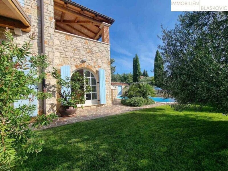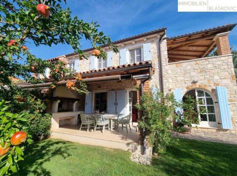 This very well-kept semi-detached house is located in a quiet location not far from Poreč and only 1 km from the sea. The stone house was built in 2006 on a plot of 367 m2 and renovated by the owners in 2021. This house was used exclusively by the owners and was never rented out! On a total of 155.55 m2 (including terraces) there is enough space for sociable and relaxing days. The property, which is kept in a Mediterranean-rustic style, has a wonderfully well-kept lawn, a Mediterranean garden and a variety of plants and an old olive tree. The garden also offers space for a 30 m2 swimming pool. On the ground floor there is a bedroom, a bathroom, a large living room with fireplace and a kitchen with dining room. From the living room and the kitchen you have access to the covered terrace with another fireplace, dining area and the garden. On the upper floor there are two additional bedrooms, each with its own bathroom, which in turn share a spacious covered terrace. The terrace is also connected to the garden via an external staircase. Another small stone garden house (around 7 m2) is ideal for use as a sauna. There is also an outdoor shower and guarantees showering fun in the open air. The property is completely fenced and has appropriate parking for two cars. At the back of the house is the storage or boiler room (oil central heating) and a summer kitchen. The house is being sold fully furnished (carpentry work). An alarm system including video surveillance has also been installed. Overall, a very nice property in a great location! Take your time to look at our real estate offers or let us know what your dream property should look like and where the property should be located. Our portfolio includes around 600 properties in Istria (every type of property and in every price range) and we will find the perfect property for you and will assist you with the purchase and processing with German-speaking employees. Long-term cooperation in the real estate sector makes us a competent and reliable partner for this region. Haven't found anything yet? We'll inform you about suitable property offers before anyone else. Create your own individual search agent now using the following link. We'll send you suitable properties exclusively in advance. Create a search agent - Note in accordance with the Energy Certificate Submission Act: An energy certificate has not yet been submitted by the owner or seller, after we explained the general obligation to submit it and requested that it be created. Therefore, at least an overall energy efficiency corresponding to the age and type of building is agreed. We accept no guarantee or liability for the actual energy efficiency of the property on offer.