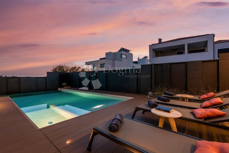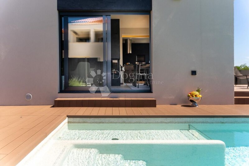 Welcome to the world of incomparable luxury and opulence, where a carefully created villa opens the door to a new life filled with ultimate pleasure, elegance and sophistication just for you. The pure comfort of this spectacular luxury villa begins as soon as you enter. With modern technology, the sliding gate opens automatically via mobile phone, introducing you to the enchanting world of luxury. You arrive at a paved area intended as a parking space for two cars, and in front of you is a beautiful lawn, surrounded by various plants that make the yard a real oasis of peace. The oasis of peace continues with the outdoor kitchen and dining set, providing the perfect setting for summer evenings. Every meal preparation in this open kitchen will be even more fun, while your loved ones enjoy the heated pool or sunbathe on the deckchairs in the relaxation zone of this beautiful villa. The villa consists of two separate residential units, each uniquely designed to meet the highest standards. When you step into the interior of this spectacular villa, designer-refined opulence awaits you, so this residential unit brings an impressive concept of a spacious living room and dining room that are separated from the kitchen only by an elegant fireplace, which creates a warm atmosphere during winter evenings. The space is illuminated by natural daylight thanks to large glass walls, and from the living room you can easily access the outdoor relaxation area and the pool. Through the kitchen, "sliding doors" lead to the utility room, and then to the private gym, fully equipped for exercising in the privacy of your own home. There are two bedrooms on the first floor. The master bedroom has its own bathroom and space for storing clothes, and the bed offers a fabulous view of the sea. The second room is also spacious with a bathroom separated only by a glass wall, which gives the room a modern - minimalist touch. Both bedrooms have spacious terraces with enchanting sea views. Further, we climb the stairs to another floor of the villa where there is a third bedroom with hidden storage space and a spectacular bathroom with a spacious brick bathtub. This bathtub offers a special experience of relaxation, whether you are alone or in a couple. The second residential unit brings a different concept, but just as impressive. Entering the apartment, you climb the elegant stairs to the spacious living room that connects to the kitchen. Bright and airy, the kitchen is equipped with high-quality household appliances of well-known brands. On this floor there is also a modern bathroom with a spacious walk-in shower. The upper floor offers two bedrooms, a double and a children's, and another bathroom. This residential unit also offers a beautiful view of the sea. Walking through this villa, you will feel how design details blend perfectly with functionality, providing an incredible impression of space, light and comfort. Top quality furniture in accordance with modern design, is extremely comfortable and provides a feeling of luxury at every step. This modern villa is truly a masterpiece of design and luxury. Her style, high standards and attention to detail provide unconditional comfort. For those who value and strive for pure hedonism, this villa will not only meet their expectations, but will also exceed them. The villa, located just 7 minutes' walk from the beach, is located in the Špadići settlement in Poreč, and will provide you with the perfect place for year-round living, enjoying the beautiful coast and exploring the magical beauties of Poreč. Spadići Village offers you everything you need for a pleasant stay. There are various restaurants, cafes and shops near the villa. Total area: Ground floor 105.62 m2 First floor 111.72 m2 Attic 83.35 m2 Terraces 16.75 m2 ADDITIONAL ADVANTAGES OF THE VILLA: - Smart home - Automation of the entrance via Smartphone - Heated pool - Electric shutter lifters - Private gym - Floor heating (electricity) - Automatic irrigation - Video surveillance - Alarm - Fully furnished.