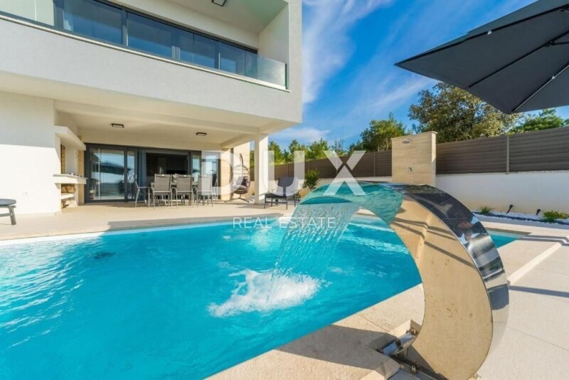 ZADAR, ZATON - Luxury villa 100 meters from the sea The town of Zaton is an extremely popular tourist destination, given the beautiful beaches in the area and the proximity of the urban center of Zadar, which is only 15 km away. Right next to Zaton is the historic town of Nin, known for its many interesting historical and cultural monuments dating back to prehistoric times. For example, you can see the remains of the Roman forum there, and the remains of medieval and ancient Croatian war and merchant ships called kondurs were also found in Nin. In Nin there is also the longest sandy beach in Croatia called Kraljičina plaža. In the Nin lagoon there is also a locality with healing mud Peloid, whose beneficial properties were known even in Roman times. For sale is a luxurious villa in Zaton, just 100 meters from the sea. Its garden, designed with the same precision, emphasizes functionality and comfort. This villa offers an enchanting view of the sea and the surrounding greenery from anywhere inside it - from the ground floor, through the upper floor to the roof terrace. The total area of this property is 520 m2, including 194.23 m2 of living space, 293 m2 of garden, a children's playground of 62 m2 and a 30 m2 swimming pool. The interior of the villa is spread over two floors. The ground floor contains a living room with a dining room and a kitchen fully equipped with all appliances and accessories, a toilet and a storage room. Large glass sliding walls allow access from the dining room and kitchen to a spacious covered terrace with a large barbecue, next to which there is a heated swimming pool equipped with deckchairs and umbrellas. The courtyard near the pool also offers an outdoor shower, while a separate children's playground is equipped with a soft floor to ensure safety during children's activities. A staircase lined with quality oak wood 4 cm thick leads to the first floor, where there are four comfortable bedrooms, each with its own bathroom. Two rooms have access to the balcony with a view of the sea and nature around the house. Each room has been designed with special attention to comfort and practicality, equipped with custom-made furniture, while the master bedroom has its own wardrobe. The villa also has a partially covered roof terrace of 64.53 m2, providing additional space for relaxing, sunbathing and enjoying the wonderful panoramic view of the surroundings. Underfloor heating and wall-mounted air conditioners for cooling ensure a comfortable temperature in all rooms. This property is extremely special not only because of its architecture and decoration, but also because of the unique location that offers access to two types of beaches - pebble and sandy, and the proximity of shops, public transport, ATMs, as well as two cities: Nin and Zadar, emphasizes the practicality of the location , making this villa a perfect combination of exclusivity and practicality. Dear clients, the agency commission is charged in accordance with the General Business Conditions www.dux-nekretnine.hr/opci-uvjeti-poslovanja Stefani Kapel Agent s licencom E- www.dux-istra.com ZADAR, ZATON - Luxury villa 100 meters from the sea.