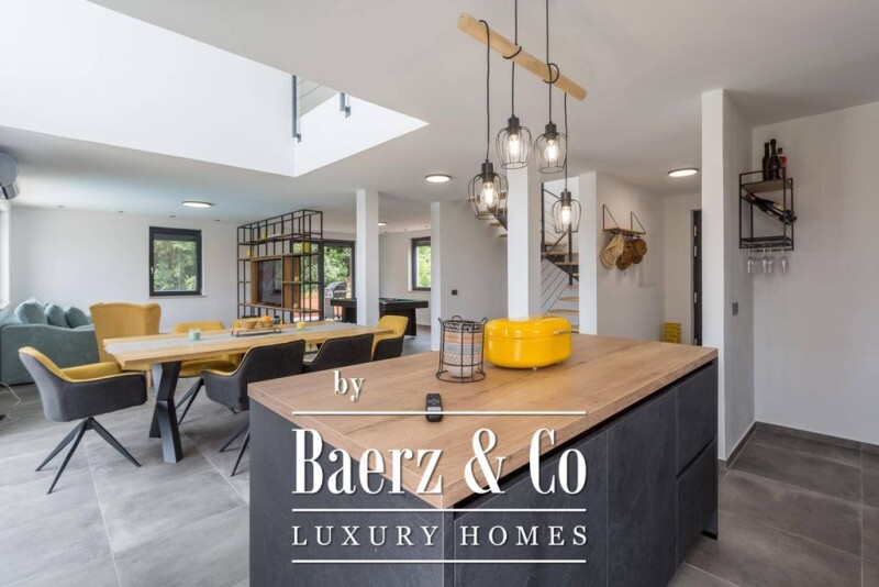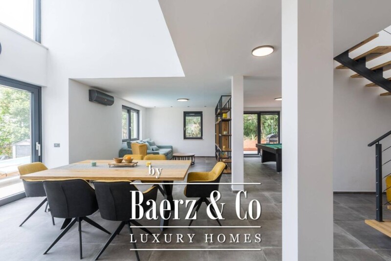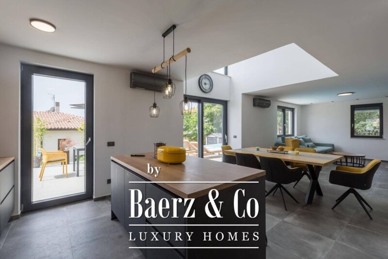 Umag, a modern house in a beautiful, quiet location with a total area of 206.45 m2 on a plot of 635 m2, which includes a 36.00 m2 swimming pool, sundeck, pergola, greenery and three outdoor parking spaces. The villa is built on two floors: Ground floor: entrance hall, living room, open plan kitchen and dining room with access to the terrace and garden, pantry, guest toilet and study with access to the terrace. First floor: staircase, three bedrooms with bathrooms, sauna. Top quality construction, only the best materials and equipment were used in the decoration. This perfectly peaceful and relaxing place is only 4.5 km from Umag and 1 km from Kanegra beach. All other information on request.