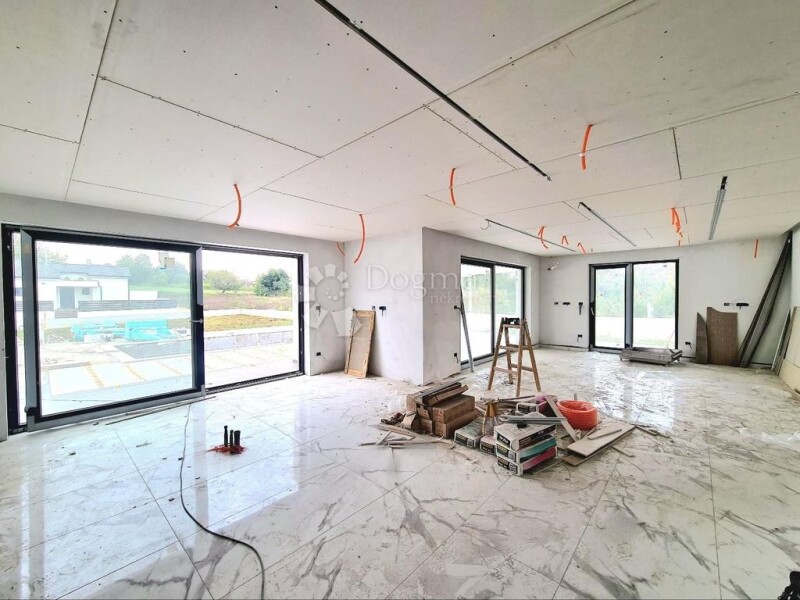 Istria, Labin, surroundings The east coast of Istria with a view of Kvarner and the far-known tourist pearl of Rabac and the crystal clear sea is richer for this wonderful villa on a spacious plot. The villa is located on a hill, 6 km from Labin and 12 km from the far-known beaches of Rab. Located on a plot of 1310m2, it is sold fully furnished and decorated. The total net area of the house of 180.99m2 is distributed over the ground floor and first floor. On the ground floor, an open space concept (60m2) of kitchen with dining room and living room was designed to emphasize the space and provide airiness to the space, and additional light and warmth are provided by large glass walls in the living area. In the continuation, there is an exit to the sunbathing area and a swimming pool of 40 m2 in a spacious landscaped garden. The first floor is designed as a night area with three en suite bedrooms, and the master room has its own terrace. Air conditioners with inverters are provided for cooling (every room), while the heating would be underfloor heating (all included in the price), and for an additional winter atmosphere, a wood-burning fireplace on the ground floor. Pool size 4x10. Floors: ceramics, parquet Expected completion date January 2023. Part of the price is sold by a private entity and part by a company, and VAT is included in that part of the price, so the buyer is partly exempt from paying real estate sales tax. You only need personal things and the house is ready for you.