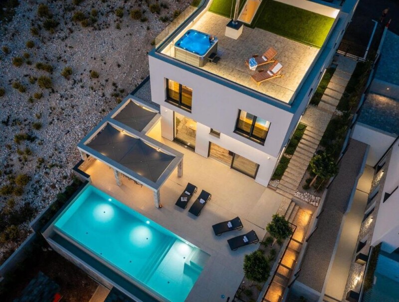 Location: Šibenik Built: 2022 Šibenik center: 12 km Sea: 0.3 km Airport distance: 30 km Inside space: 360 m2 Plot size: 1123 m2 Bedrooms: 6 Bathrooms: 6 Swimming pool: 45 m2 Parking: 6 Air-conditioner Gym Sauna Cameras Patio Playground Garden.