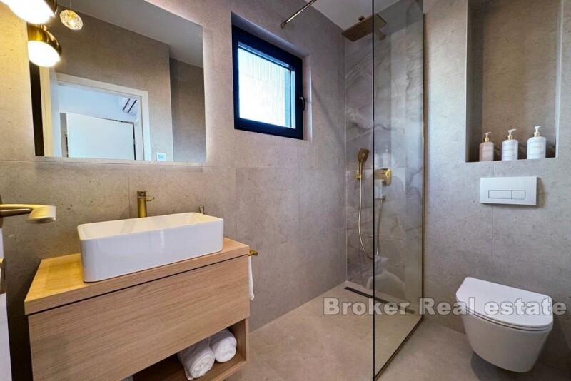 This modern, newly built villa with a swimming pool and jacuzzi is the perfect choice for those looking for a luxurious home or investment on the eastern side of Split. Situated on a plot of 780 m², the villa has a spacious living area of 360 m², providing enough space for a comfortable family life or a tourist rental. The layout of the rooms ensures maximum functionality and comfort. In the basement there is a gym, a playroom and a laundry room, which enables an active and organized lifestyle. The ground floor includes an elegantly decorated kitchen, a dining room, a spacious living room, a sauna and two rooms with private bathrooms, ideal for the privacy and comfort of guests. On the first floor, there are four rooms, each with its own bathroom, and a study, perfect for business duties or hobbies. The roof terrace, accessed by a separate entrance, offers a beautiful view of the sea, perfect for relaxation. The spacious garden, decorated with Mediterranean plants, further enriches the experience of living on this property. Enjoying the pool, jacuzzi and beautifully decorated summer kitchen with barbecue makes this villa ideal for relaxation and social gatherings. The villa is sold fully furnished, and thanks to its quiet location and proximity to the sea, it is an excellent choice for year-round family life, but also as an investment opportunity in tourism, given the excellent occupancy so far.