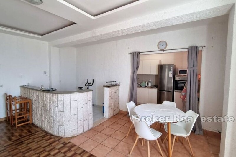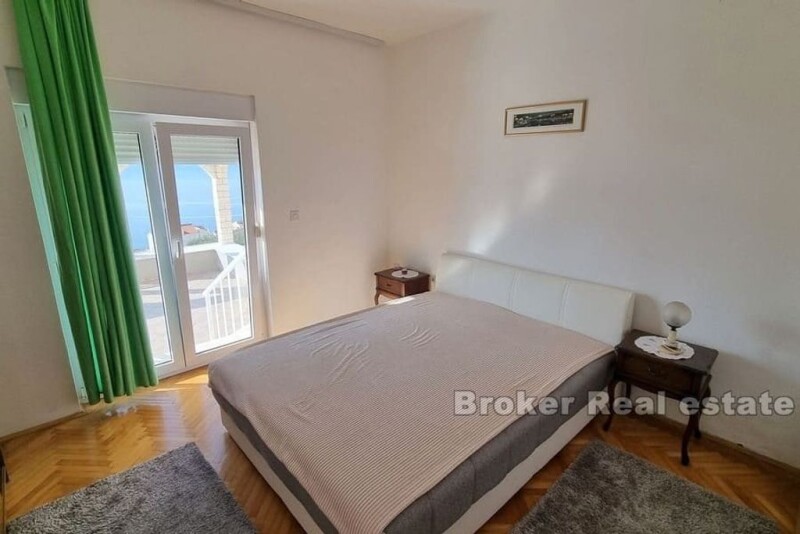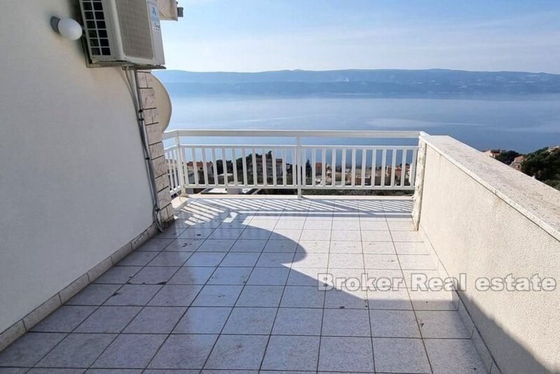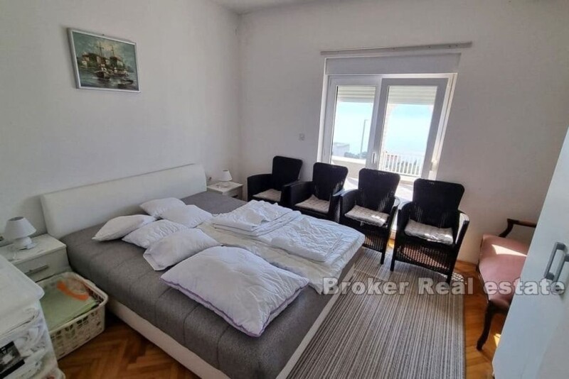 A house with an open sea view just a few kilometers from the town of Omiš. The property with a living area of 450 m2 is located on a plot of land of 350 m2 and is spread over four floors. In the basement of about 80 m2 there is a kitchen, a dining room, a living room, a room with a bathroom and an exit to a large terrace with a view of the sea. On the ground floor of the house, which has a separate entrance, there are four rooms, each of which has its own bathroom, and a kitchen with a dining room. The ground floor leads to a large, spacious terrace with a stunning view. On the first floor of the house there is an apartment with two bedrooms, two bathrooms, a large living room and a kitchen and dining room, as well as balconies with an open view of the sea. On the second floor of the house there is another apartment with two bedrooms, two bathrooms, kitchen and dining room and living room. On the second floor there are as many as 3 balconies and a large terrace. There are two garages and a large parking lot with 10 parking spaces on the adjacent lot. Central heating and solar panels are installed in the house. All units are air-conditioned. The property is sold fully furnished. The house is located in a quiet location only 4 km from the town of Omiš and close to all amenities necessary for a comfortable life. There is a beautiful pebble beach nearby. The property is an ideal choice for a tourist business or a family holiday home.