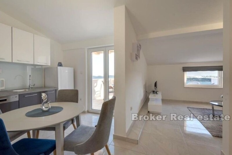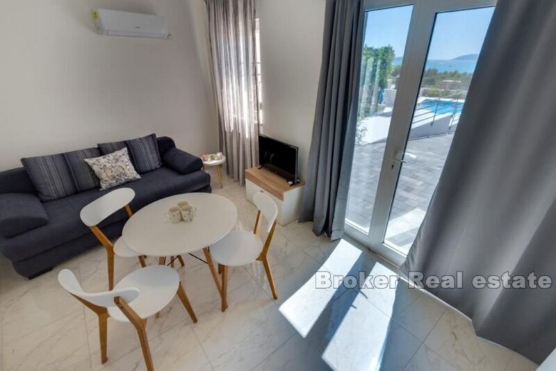 House with pool and open sea view in Sibenik. This beautiful house of 600 m2 is located on a plot of 800 m2. The property is spread over three floors which are distributed over a total of eight apartments from which there is an enchanting view. There are four apartments on the ground floor: 1. Two bedroom apartment of 60 m2 (kitchen, living room, 2 bedrooms, 2 bathrooms and terrace) 2. Two bedroom apartment of 60 m2 (kitchen, living room, 2 bedrooms, 2 bathrooms and terrace) 3. One one bedroom apartment of 50 m2 (kitchen, living room, bedroom, bathroom and terrace) 4. Studio apartment (kitchen, living room, bathroom and terrace) On the first floor there are three apartments: 1. Two bedroom apartment of 60 m2 (kitchen, living room, 2 bedrooms, 2 bathrooms and terrace of 50 m2) 2. Two bedroom apartment of 60 m2 (kitchen, living room, 2 bedrooms, 2 bathrooms and terrace of 50 m2) 3. One bedroom apartment of 50 m2 (kitchen, living room, bedroom, bathroom and terrace of 20 m2) There are two apartments in the loft: 1. Two bedroom apartment of 60 m2 (kitchen, living room, 2 bedrooms, bathroom and terrace of 25 m2) 2. One bedroom apartment of 50 m2 (kitchen, living room, bedroom, bathroom and terrace of 25 m2 One one-bedroom apartment is located separately from the others and has separate stairs. Below it are the laundry and boiler room. In the yard there is a beautiful pool overlooking the sea and islands. In front is a parking lot with eight parking spaces. The location is excellent near beaches and restaurants at a distance of 300 m from the sea. Distance from the airport is 60 kilometers.