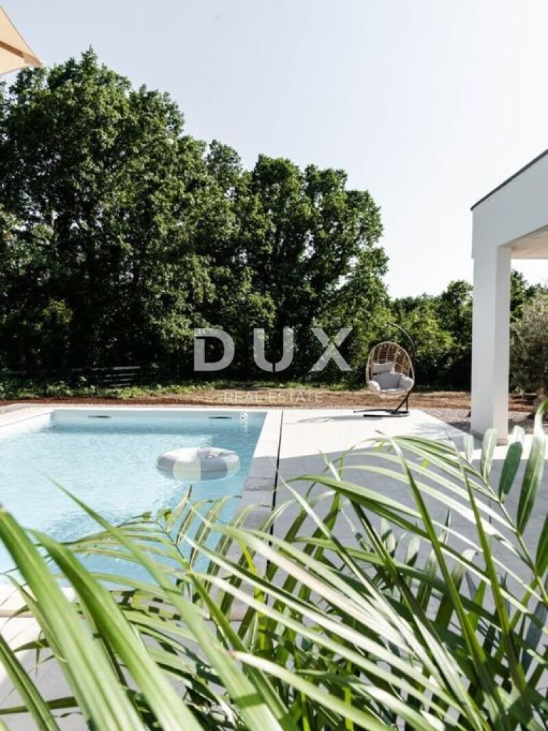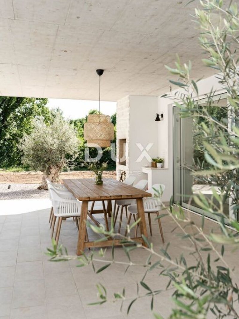 ISTRIA, LABIN - Modern one-story house with swimming pool The site of today's picturesque town of Labina, located on a hill 320 meters high, only about 3 kilometers from the sea, was apparently inhabited as early as 2000 BC. Rarely does the wealth of architecture and cultural-historical monuments combine so charmingly with numerous art studios and the breath of youth that gathers there. After a walk through the streets of the Old Town, visit the City Museum with an archaeological and ethnological collection and a mine model unique in this part of Europe, take a peek into the art studios, and enjoy the beautiful view from the city's Fortress of the sea, Kvarner and the islands of Kvarner. This modern one-story house is located in a quiet village 5 km from the center of Labin and a 10-minute drive from the tourist center of Rabac. The house is designed as a single-storey house with 146 m2 of living space, which includes three bedrooms with their own bathrooms, a guest toilet and an open space concept kitchen, dining room and living room with access to a covered terrace with a summer kitchen. It is sold completely finished, decorated and equipped. The yard has 1491m2 with a swimming pool and a garage. Heating and cooling are solved by means of inverter air conditioning, and floor heating in the bathrooms was additionally installed. Quality materials were used in the construction of the house, and the interior has a minimalist and modern design. The location of the property ensures peace and privacy and a beautiful view of the surrounding nature and greenery. Call us for a viewing so you can experience all the charms of this beautiful, newly built villa. Dear clients, the agency commission is charged in accordance with the General Business Conditions: www.dux-nekretnine.hr/opci-uvjeti-poslovanja Stefani Kapel Agent s licencom E- www.dux-istra.com ISTRIA, LABIN - Modern one-story house with swimming pool.