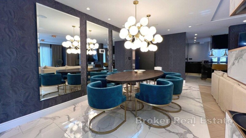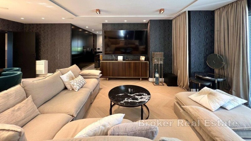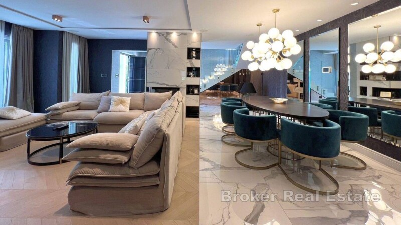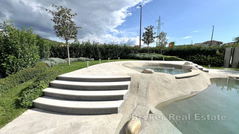 For sale, a luxurious villa located in a quiet part of the city, ideal as a combination of comfort, luxury and privacy. This impressive property sits on a plot of 1294m2, while the living area of approximately 280m2 offers superb design and spaciousness over two floors. The ground floor of the villa exudes elegance and functionality. The entrance hall leads to a spacious living room with an open concept thath combines the living room with the dining room and the modern kitchen. Large glass walls provide plenty of natural light and direct access to the beautiful terrace overlooking the garden with pool. On the ground floor there is also a luxurious bedroom with access to the garden terrace, one toilet and an engine room/storage room with additional access to the back garden. The internal staircase leads to the first floor, where there are three superbly equipped bedrooms, one of which is a children's room with access to the balcony, and the master bedroom, which stands out for its private bathroom, spacious walk-in closet and access to its own balcony. On this floor there is one toilet and a luxurious bathroom with jacuzzi tub. Approximately nine parking spaces and two garage parking spaces are provides on the property. Also in front of the property there is a spacious swimming pool and jacuzzi, which is unique in its construction and such is rerly seen in Croatia, an outdoor terrace with an outdoor kitchen and an outdoor shower. The entire villa is equipped with high-quality designer furniture and the handmade, custom-made joinery adds to the feeling of comfort. In addition to the top security provided by burglar-proof doors, glass walls with UV protection reduce heating by 25% – 30%, while the underfloor heating system that extands throughout the property and air conditioning ensure comfort in the villa. This luxury villa is the perfect choice for family life or investment, thanks to its quiet location close proximity to all urban amenities and beautiful natural surroundings that provide a feeling of complete privacy and harmony.