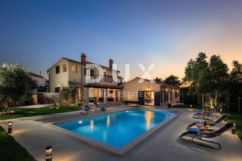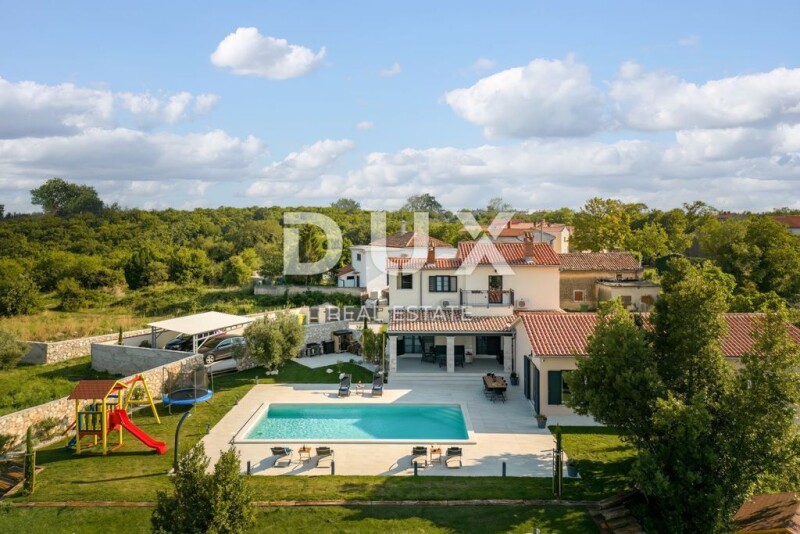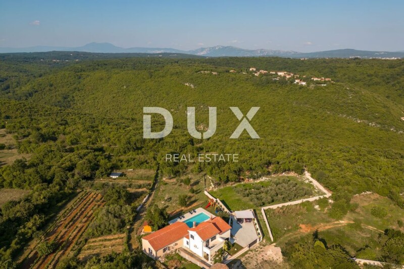 ISTRIA, LABIN - A piece of paradise with a breathtaking view Labin is a town located on the Istrian peninsula. It is known for its rich history, stunning landscapes and well-preserved medieval architecture. The city has a charming old town, beautiful churches and historical sites that attract tourists interested in exploring its cultural heritage. In addition, Labin has a lively art scene, with numerous galleries and cultural events throughout the year. Not far from Labin, in a small village with fantastic views, this beautiful piece of paradise is for sale that will leave you breathless! It is a beautiful first-class villa with a pool that offers complete peace and privacy. Its area of 272.5 m2 extends through the ground floor and the first floor. The ground floor of 187.25 m2 consists of a kitchen with an island of 24.10 m2, which is connected to a living room of 26.90 m2, a dining room and a playroom of 42.95 m2, from where there is access to a covered terrace of 30 m2 and a garden with a swimming pool. On the ground floor there are also two bedrooms with their own bathrooms, another covered terrace of 15.10 m2, a toilet of 2.55 m2 and a corridor of 7.05 m2. The internal stairs lead to the floor with a total area of 70.85 m2, and it consists of a hallway of 9.05 m2, one bedroom of 16.85 m2 with a bathroom of 5.70 m2 and another bedroom of 12.45 m2 with a bathroom of 7.15 m2. Each room has its own balcony. The villa is equipped with six air conditioners that are used for cooling and heating, and a fireplace in the living room that, in addition to the atmosphere, heats the entire ground floor of the villa. On the terrace there is a summer kitchen with a barbecue with access to a large heated pool of 50 m2 and a sun deck around the pool of 163.30 m2. The villa is built and equipped with top quality materials, furniture and appliances and is sold fully furnished. It's just up to you to bring your things and move into this superb home. For additional security, the villa is equipped with 4 surveillance cameras and an intercom with a camera. There is also a charging station for electric vehicles on the garden plot, and there is space for a total of 5 vehicles, of which 2 spaces are covered. The yard is decorated with grass and various Mediterranean plants: oleanders, cypresses, lavender, immortelle, rosemary, bougainvillea, wisteria, and there is a private children's park equipped with a sandbox, swings, a trampoline and a slide. The villa has an A+ energy certificate and everything is prepared for the installation of solar panels. Don't miss investing in this unique property! Dear clients, the agency commission is charged in accordance with the General Business Conditions: www.dux-nekretnine.hr/opci-uvjeti-poslovanja Tina Širol Agent s licencom E- www.dux-istra.com ISTRIA, LABIN - A piece of paradise with a breathtaking view.