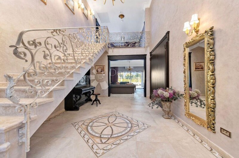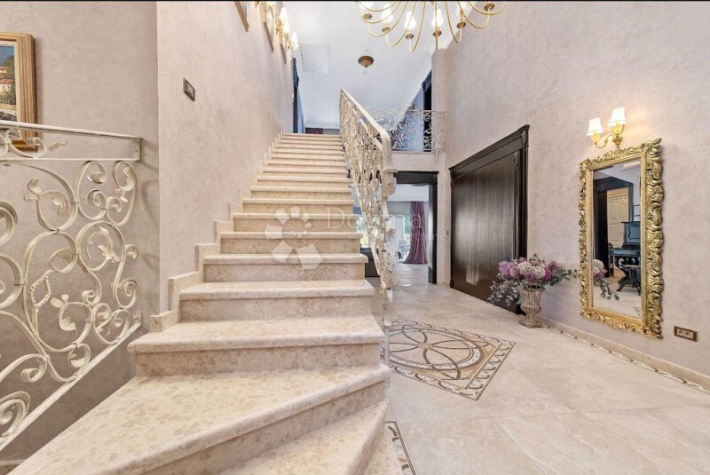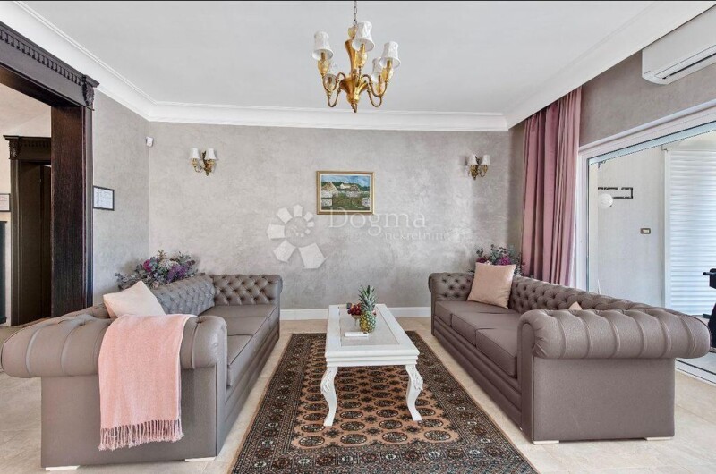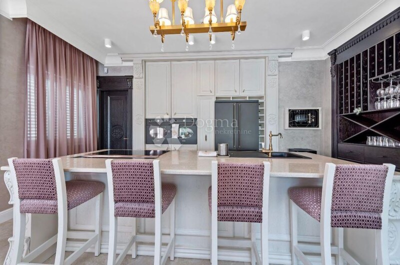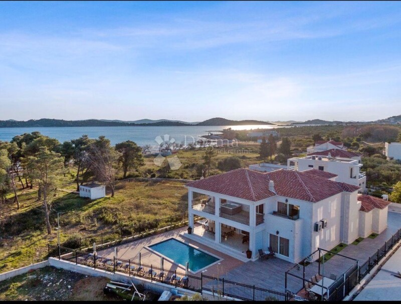 Luxury house with high quality interior, located on the beach in the famous tourist town of Vodice. The impressive appearance of this villa with a beautiful sea view is characterized by a historical-classical facade and representative size. In a carefully designed interior design, the villa consists of 2 floors and covers an area of 530 m2. The villa is fully equipped and has five bedrooms with double beds. The villa also has five bathrooms and a separate toilet. The kitchen leads to a spacious dining room equipped with a massive table and a living room where you can taste liqueurs and wines. On the first floor there is an outdoor jacuzzi on the balcony overlooking the sea. The outdoor area is complemented by a beautiful swimming pool and a terrace with the possibility of complete closure, where there is also table football, billiards and a space for socializing. For complete enjoyment, you will be delighted by the spacious Turkish steam bath and Finnish sauna. Perfect workmanship of high quality materials and various features characterize this special villa. The concept of the room and the floor plan is open and flexible, which results in high comfort. Both families and couples with high living space requirements will find a magnificent home here. Designed with great attention to detail, the villa combines local materials, such as Istrian stone and high-quality furniture from around the world to create a pleasant ambience for you. There is space for one vehicle in the garage and three more in the closed driveway. We will be happy to explain additional details about this property. Additional features of the property: - The interior carpentry and kitchen are handmade from solid oak wood - Istrian stone on the internal staircase, bathrooms - All windows and doors with security glass - Double-leaf solid wood front door - Solar collectors for hot water - Alarm and video surveillance - Garage, technical room and storage - Motorized sliding garage and access doors - Massive entrance pillars - Large pool terrace and sun deck - Some pieces of furniture are from different parts of the world The nearest airport is Split Airport (49 km) Restaurant (500 m) Plaza (100 m).
