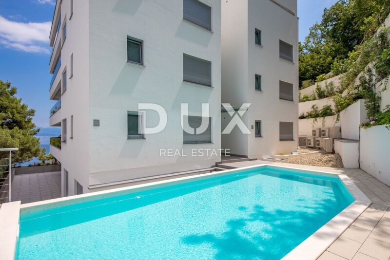 OPATIJA, CENTER - OPPORTUNITY - exclusive apartment in a new building with sea view, shared pool, garage We are selling a beautiful modern apartment P5 above the center of Opatija with panoramic sea view, terrace, pool, elevator and two parking spaces in the garage. This modern and exclusive property stands out for its southern orientation with beautiful views, sliding glass walls that allow for an unobstructed view and lots of light throughout the year. The apartment consists of two bedrooms, two bathrooms and one toilet, and a beautiful open space living room is connected to the dining room and kitchen, and from the entire space there is an exit to the terrace where you can enjoy the beautiful view of the blue sea. We highlight: - fantastic SCHUCO aluminum joinery - first-class parquet - electrically operated blinds - top-quality sanitary ware - Italian ceramics - security entrance door - elevator - shared pool - energy-efficient construction and insulation The apartment has access to a shared pool, and also has an elevator and two parking spaces, one of which is in the garage and the other is uncovered. The location of the apartment is fantastic: a peaceful and quiet street above the very center of Opatija, close to the beach and the Lungomare promenade. The beach can be reached on foot in just 8 minutes, and by car it really only takes one minute. It is important to note that the building is surrounded by forest greenery. This is a perfect opportunity to buy a fantastic property in one of the most beautiful cities on the Adriatic. Ideal for living, as well as for tourist rental or investment. Dear clients, the agency commission is charged in accordance with the General Terms and Conditions. Patrik Hrštić Agent s licencom E- www.dux-opatija.com Marko Šutanovac Agent s licencom E- www.dux-opatija.com OPATIJA, CENTER - OPPORTUNITY - exclusive apartment in a new building with sea view, shared pool, garage.