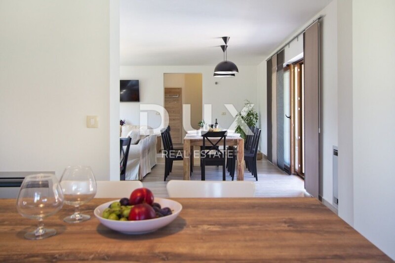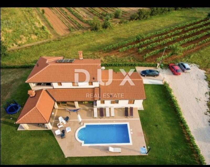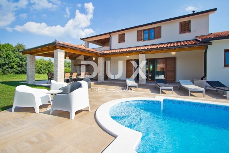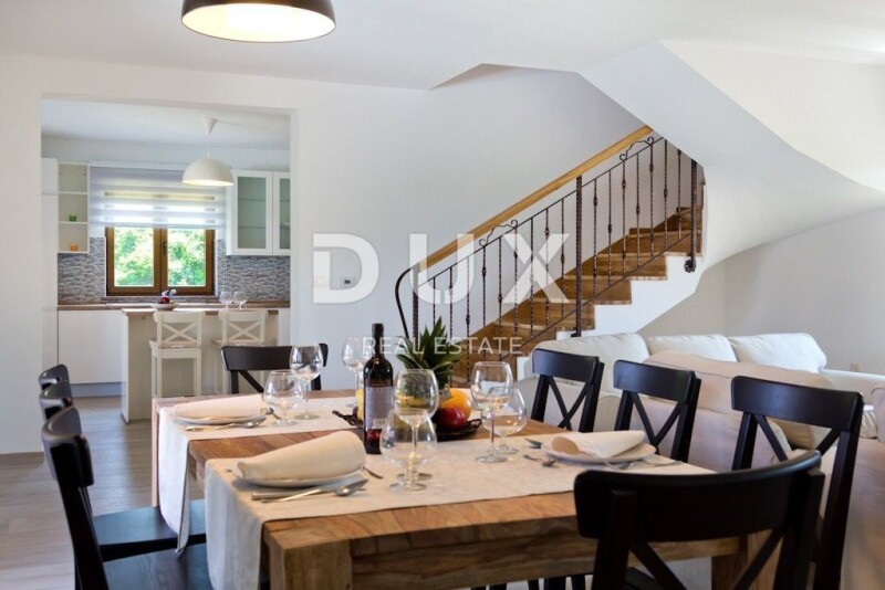Istria, Labin - Beautiful villa with swimming pool in green surroundings. On a hill above the tourist town of Rabac is the medieval town of Labin, whose old name Albona was first mentioned in 285 AD. Today, it is a cultural and administrative center where the wealth of architecture and cultural and historical monuments is rarely combined so charmingly with numerous art studios and the breath of youth that gathers there, especially in the evening, in numerous cafes. In the eastern part of central Istria, on a high plateau above the Raša river valley and in the hinterland of the town of Labin, lies Sveta Nedelja. The special location, the proximity to the sea, but also to lush forests, means a holistic combination of green and blue. This area is full of architectural remains that will tell you the story of the long and interesting history of this area and awaken in you the desire to explore and discover why the rich from ancient times chose this very area as the place to build their country estates. This beautiful villa is located at a distance of about 9 km from the center of Labin, surrounded by vineyards and beautiful nature in a quiet and smaller settlement. It is located about 13 km from the famous tourist town of Rabac, with beautiful beaches, walks, nature, and a rich tourist offer. Istria, Labin - A beautiful villa with a pool in a green environment, 210 m2, consists of two floors. On the open ground floor, you can prepare homemade meals in a modern and fully equipped kitchen with a dining area or relax in a beautiful living room with a fireplace. On the ground floor there are also 2 bedrooms (ensuite) with their own bathrooms, as well as a separate toilet and storage room. A beautiful internal staircase leads to the upper floor, where there are two bedrooms each with a bathroom, a large covered balcony with a beautiful view of the green landscape, from which there are entrances to the home gym with a toilet. The living room opens onto a beautiful partially covered terrace. There is an outdoor grill in the covered part of the terrace. The BBQ area is bordered by a traditional dry wall with hand-hewn stone, and the terrace is connected to a landscaped beach with a 32 m2 swimming pool. The yard is bordered by a maintained green fence. Two covered parking spaces are planned. This beautiful villa is surrounded by vineyards and green meadows which offers an additional sense of peace and privacy. On the garden of 1160 m2 next to the pool and bbq area with garden furniture with enough space for a large family and friends, there is also a children's corner with a trampoline. A well-maintained yard with a lawn completes the impression of this excellent property. During the construction of this villa, special attention was paid to the details and the materials used. Heating and cooling is via a fan cooler and a heat pump, and there is a fireplace in the living room for a more special atmosphere during the winter months. This property offers you the opportunity to escape from the city lifestyle in a quiet and safe location surrounded by greenery and untouched nature. Apart from the fact that the villa is ideal as a family oasis, it is also interesting as a villa option for tourist rental. Dear clients, the agency commission is charged in accordance with the General Terms and Conditions. www.dux-nekretnine.hr/opci-uvjeti-poslovanja. Tina Širol Agent s licencom E- www.dux-istra.com ISTRIA, LABIN - Beautiful villa with pool in a green environment.