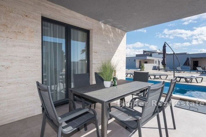 An exceptional opportunity to join the growing tourist market on the attractive island of Vir. The resort with small villas, built on a spacious land of 3560 m2 in total, consists of nine villas, a central building and a playground. Located not far from the sea and beaches, offering an irresistible investment perspective for the future owner. An average of 350 m2 belongs to each of the houses, in front of which there is a swimming pool, parking and a landscaped garden with outdoor furniture. The interior of the ground floor apartment of approximately 107 m2 consists of a bathroom, two bedrooms with attached bathrooms, an equipped kitchen with a dining room and a living room. An air conditioner is used for heating and cooling, which is located in each room. The central building spans two floors and consists of a reception, laundry, fitness and spa rooms. The villas are categorized with 4 stars, for 4 people + 2, and the entire resort can accommodate a total of 54 people. The resort also has a court for basketball and indoor football, and it is decorated with planted palm trees, oleanders, pittospora bushes and impressive olive trees.