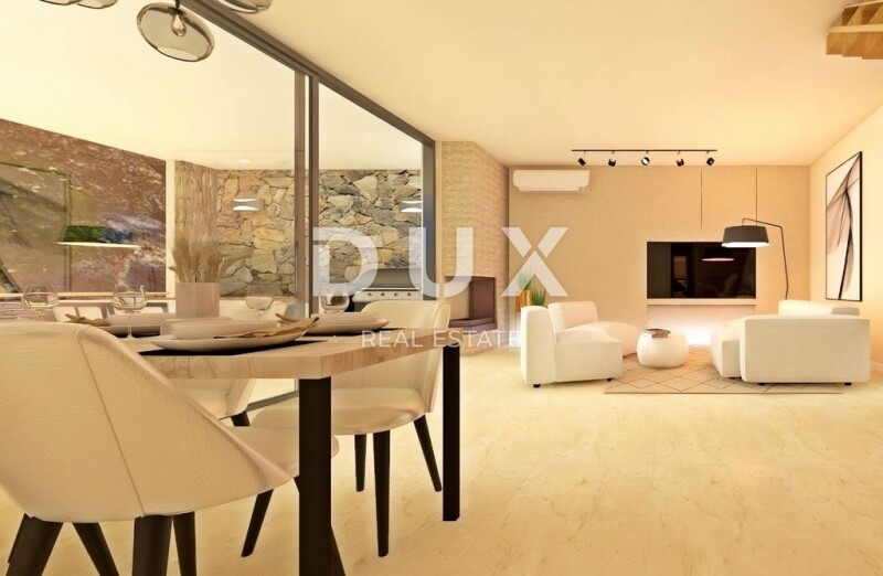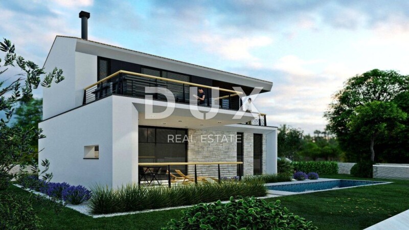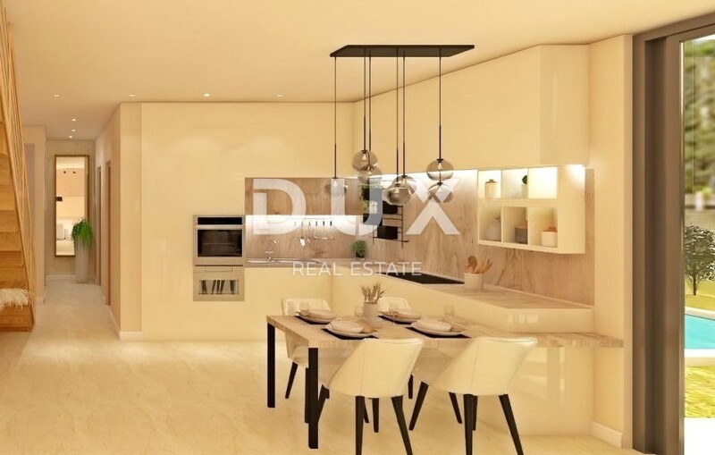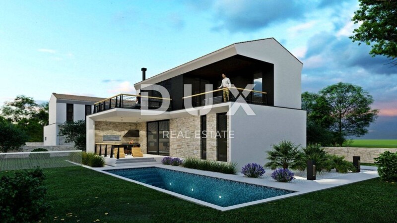 ISTRIA, LABIN - Modern new construction on the edge of the village On the southeastern coast of Istria, where green hills meet the sea, where nature and heritage meet, there are two towns of similar size but with different but mutually complementary characters - Labin and Rabac. The picturesque town of Labin rises on a hill 320 meters high, only five kilometers from the white pebble beaches in Rabac. Intertwined with rich history and mining that marked this region, Labin, which was declared an independent republic for a short time, is today a fascinating city of contradictions; old and new, history and present, tourism and art. Not far from the town of Labin, there is a modern new building for sale on the edge of the village. Located at the end of an idyllic settlement with only a few houses nearby, it was designed respecting the profession, legal regulations and spatial planning documentation and was built according to the highest standards for residential construction. With its tame architecture, it does not disturb the environment, but creates a synergy of the natural environment, traditional Istrian architecture and modern design. Tradition is symbolized by stone and a gable roof, and a contemporary expression by a large-format glass wall. Design simplicity resulted in the creation of a compact floor plan and a pleasant airy space. It was conceived as one residential unit with a net area of 111.4 m², which extends over two floors with a modern interior that exudes elegance and simplicity and provides a high level of comfort. The ground floor consists of an open concept space that unites the living room, dining room and kitchen with access to a covered terrace containing a summer kitchen. The floor plan of the ground floor is complemented by a bathroom and a technical room. There are two bedrooms on the first floor, one of which is the master bedroom with its own bathroom with sauna and access to two terraces; uncovered and covered terrace containing a hot tub. The yard is completely fenced and elegantly decorated with grassy areas and Mediterranean plants, and the central place is occupied by a 24 m² swimming pool with a sunbathing area. This perfectly integrated property is an exceptional opportunity for a comfortable family life as well as an investment investment in the tourist rental business. The planned completion of works and furnishing and handover of the property is scheduled for the end of 2024. Dear clients, the agency commission is charged in accordance with the General Business Conditions: www.dux-nekretnine.hr/opci-uvjeti-poslovanja Iva Zajc Agent s licencom E- www.dux-istra.com ISTRIA, LABIN - Modern new building on the edge of the village.