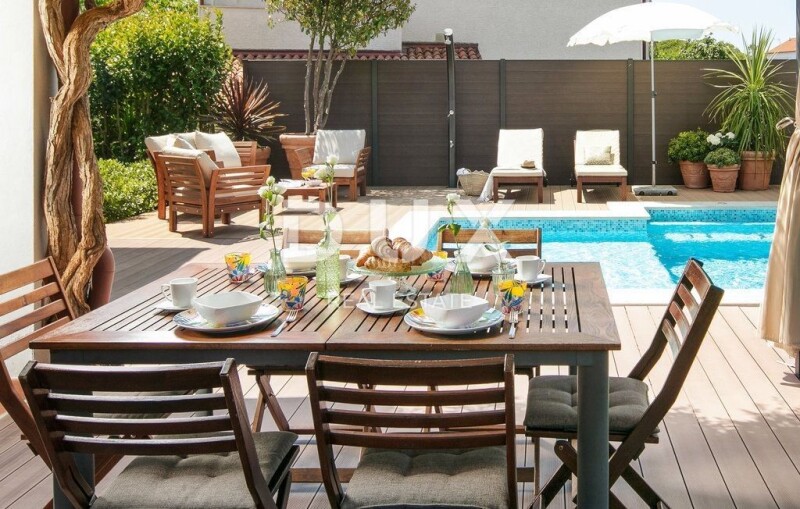 ISTRIA, POREČ - Warm family high-rise house, located on the outskirts of a small, quiet settlement, only 6 minutes from beautiful beaches. We are proud to present you this really high-quality and warm villa, located in an ideal and quiet location, just a few short minutes' drive from the beautiful beaches and the center of the unmissable city of Poreč. It is a tall one-story house, built in the style of Italian and Spanish houses, which exudes the warmth of a real family home. From the beginning, the house was built as a private family home, and it served that purpose until recently, when the owners made the decision to try their hand at tourist rentals, and the results that began to follow, as well as the large number of satisfied guests, simply surprised the owners. The owner's goal during the construction of his dream family home was to use all the details of Italian and Spanish similar properties, but still leave his mark in the design of the rooms and the exterior. Thus, this property welcomes its future owners in an interestingly designed space that is maximally used in a way to ensure a high level of comfort, privacy of each room and excellent communication between the interior of the villa and the beautifully landscaped yard. Come with us to this excellent and rare opportunity, and let this beautiful villa surprise you as it did us. PROPERTY DESCRIPTION: It is a comfortable high-rise house with 330 m2 of living space, which is located on a private and maximally landscaped Mediterranean garden with a total area of 776 m2. Each room in the villa is organized in such a way as to offer maximum comfort and a sense of peace and privacy. From a quiet street without a lot of traffic, the access to the garage located in the basement of the villa, with two parking spaces, first extends. There are three additional rooms next to the garage, one is used as a boiler room or technical room, the other room is used as a larger storage room, and there is also a laundry room. Currently, the owners have used the space as a playground, considering that there is enough space around the villa for free parking on the public surface. Then, from the garage, an internal staircase leads to the high ground floor of the villa. The ground floor of the villa is cleverly designed so that it is divided into two parts with the help of a corridor or an entrance hall, a sleeping part and a part intended for daily life and entertainment. The living area of the villa is slightly divided into a separate private kitchen, then a slightly separate dining room sufficient for the whole family, and a separate comfortable living room from which there is a wonderful view and access to the covered terrace and landscaped area with a swimming pool. There is also a guest toilet in the mentioned entrance hall or vestibule. The sleeping part of the villa consists of an additional larger bathroom, then three comfortable bedrooms. Of which, two bedrooms have their own private terrace with communication to the courtyard, and one of these bedrooms is the master bedroom with its own larger bathroom. On the floor above the living room and dining room, there is a gallery, where there is an additional bedroom whose special detail is the "inner balcony" that communicates with the living room. In addition to the bedroom, there is an additional smaller storage room on the gallery. It is a property that breathes energy from another time, which means that it has a special character and gives the real feeling of a former luxurious family home. During your stay in the villa, you can experience a combination of Italian and Spanish design that is almost timeless. This property will be ideal for all those who like a more rustic style of decoration and construction. GROUND DESCRIPTION: The villa is located on a comfortable plot of 776 m2, which is completely fenced and safe from view. After deducting the space occupied by the villa and the swimming pool, what remains at your disposal is a comfortable and maximally private 500m2 beautifully decorated courtyard in the Mediterranean style. The villa's grounds are fully landscaped with numerous Mediterranean plants that create a special atmosphere during your stay in the open air. The owners take great care of the garden, so a new irrigation system was recently installed that takes care of their greenery and plants. You don't have to worry about your youngest family members and pets, because there is enough green space in the garden, safe for carefree play and fun. The central part of the garden is occupied by a high-quality swimming pool with a mosaic, which also has a water heating system. So that you can relax as much as possible in the pool after an active day, there is also a part of the pool with a hydromassage function. Next to the pool, there is a larger beach with sunbeds and a sunbed, ideal for relaxing with a glass of your own wine. A special detail of the pool is a smaller waterfall through a larger amphora, which creates a special atmosphere at night with lighting. You don't have to worry about your tin pets because the villa has a garage with the possibility of parking 2 cars, as well as two additional parking spaces in the open air in front of the garage. ADDITIONAL INFORMATION: * The villa is sold furnished with all high-quality, ready-made, timeless wooden furniture, made in Italy. * External carpentry is a combination of pine and oak. * The kitchen is made to measure from oak, and is equipped with modern household appliances in a rustic style. * Heating and cooling of the space is provided by air conditioners installed in every room of the villa, as well as central heating installed in all rooms, even in the garage. * There is also a hidden chimney in the living room, which can be used to set up a pellet or wood stove, or to build your own fireplace. The chimney is located on a smaller wall that divides the space between the living room and the dining room. * The property is tidy. 1/1,