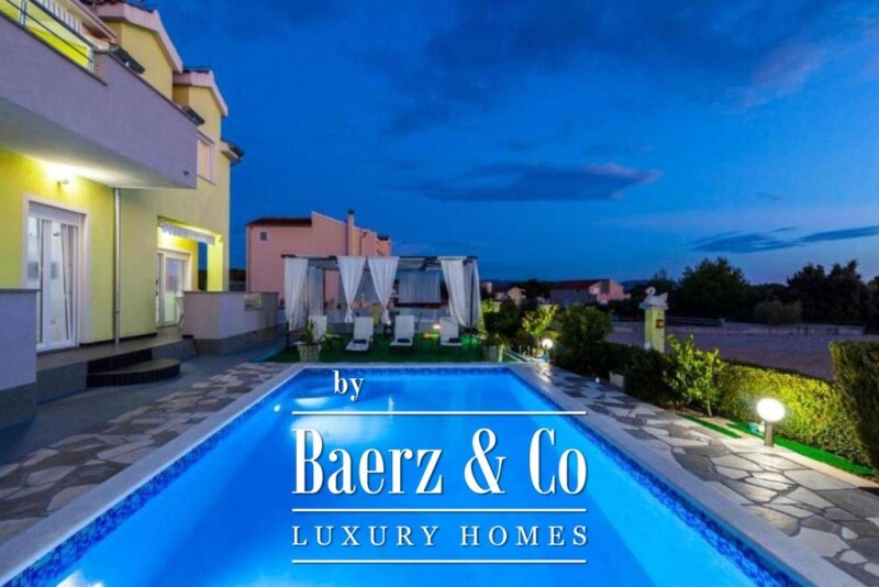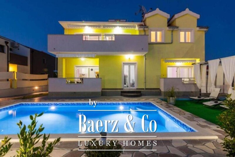 Brodarica near Šibenik, holiday home with a pool, newly built, with a sea view. The house has a surface area of 285 m2 and is located on a plot of 510 m2. Just 250 meters from the sea, in a quiet street, is this beautiful Dalmatian house spread over two floors, with a large yard, swimming pool and garden. It consists of a ground floor and first floor connected by internal stairs. On the ground floor there is a large living room with an open-concept kitchen and dining room, two bathrooms, a sauna, two large and one small room, a hallway and an entrance hall. The space is connected to the terrace where we find a swimming pool and a sunbathing area. The first floor consists of a hallway, a large living room with an open-concept kitchen and dining room, a bathroom, an additional toilet, an entrance hall, three bedrooms and a large terrace with a view of the sea and islands. The house is fully furnished, equipped and air-conditioned, and is being sold as such. There is parking for four cars in the yard. The house was built in 2013 and completely renovated, restored and remodeled in 2019. Ideally located, near the sea and the village, it is within easy reach of all amenities and yet offers an oasis of peace to enjoy your vacation and untouched nature. The popular beach and promenade are just a few minutes walk away. For more information, we are at your disposal.
