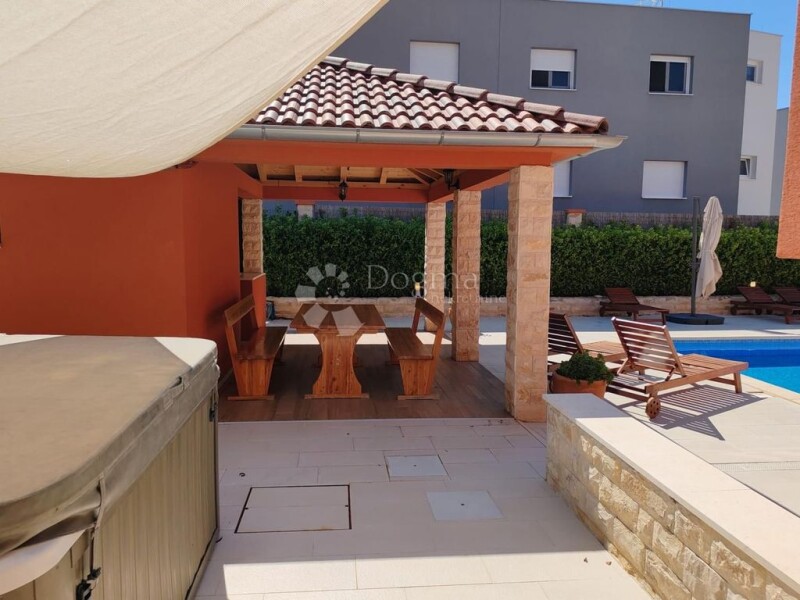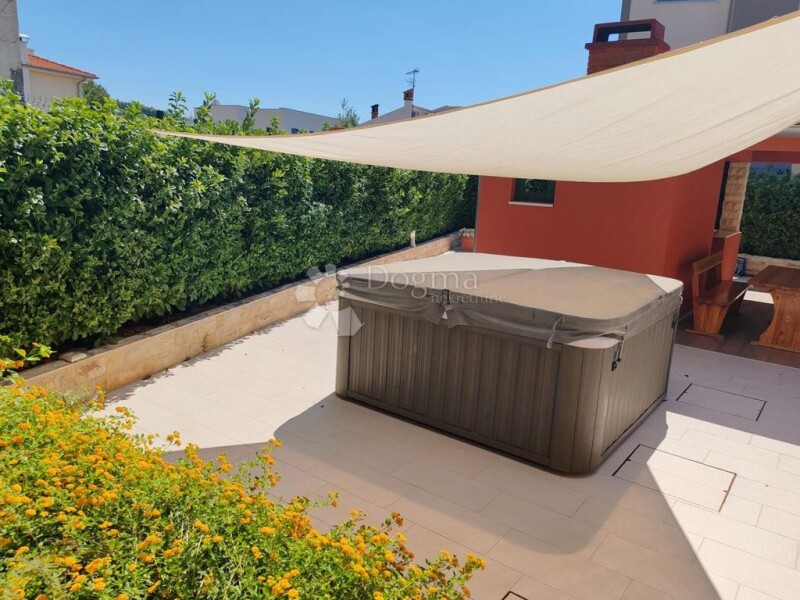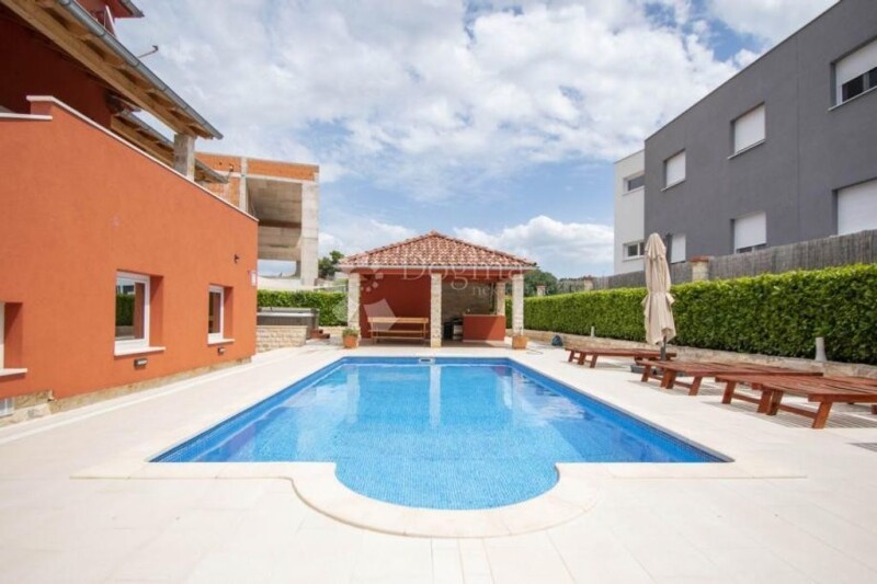 For those who are looking for a real estate gem, we offer a luxurious modern villa located in Žaborić, with an area of 350 m², on a spacious plot of 840 m². This exclusive property offers a perfect combination of contemporary architecture and modern decoration, surrounded by beautiful greenery, ideal for those looking for a perfect oasis for living or tourist rental. In the basement there is a spacious living room, a modern kitchen, a bedroom, a bathroom, a laundry room, a sauna, a fitness area and a covered terrace. The ground floor of the villa offers an elegant open space concept with a modern kitchen, living room and dining room, and there are also two bedrooms, one with its own bathroom, a separate toilet and a storage room that increases the functionality of the space. On the first floor there are three spacious bedrooms, two of which have access to the terrace, and two modern bathrooms. The yard surrounding the villa is a real oasis of peace and enjoyment. In addition to a large pool of 32 m² and a jacuzzi, the yard is enriched with a separate pool house that provides additional space for socializing. The house is equipped with an outdoor kitchen and barbecue, and the covered terrace and wooden seating make the space ideal for gatherings. An outdoor shower and toilet further increase the comfort and functionality of this beautiful space. In addition to all that, the spacious yard also offers parking with capacity for as many as six cars. Every room in the villa is air-conditioned, while underfloor heating is installed throughout the house. Solar panels on the roof ensure energy efficiency, making this villa economical, and the facade (styrofoam 10 cm) contributes to this, providing exceptional heat and sound insulation. The villa was built from top-quality materials, including aluminum joinery, and attention was paid to every detail and quality. This property represents an ideal solution for family life, but also an extraordinary opportunity to invest in tourism, thanks to its attractive location and luxurious facilities. Located in a quiet part of Žaborić, this modern villa offers luxury, comfort and absolute privacy, and the outdoor oasis by the pool with a house for socializing creates a perfect space for relaxation and enjoyment. Žaborić is a picturesque village located in the immediate vicinity of Šibenik, known for its beautiful beaches and crystal clear sea. This small place exudes an authentic Dalmatian charm, it is ideal for those who are looking for an escape from the hustle and bustle of the city, and at the same time want to be close to all the necessary facilities. Located along the coast, Žaborić is known for its natural beauty and peaceful environment, which makes it perfect for family life or summer vacation. Only a 10-minute drive from the beautiful city of Šibenik, it provides easy access to cultural and tourist attractions, as well as numerous restaurants, cafes and shopping centers. Žaborić is a popular destination for tourists, but it retains its peaceful atmosphere throughout the year, which makes it a favorite place to live. Contact us with confidence and make an appointment to view this pearl of real estate. Draženka Blazinarić +385 91 796 2322 drazenka.blazinaric@dogma-nekretnine.com.