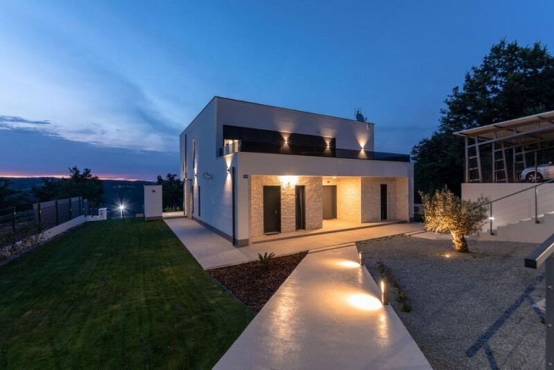 Fantastic modern villa with heated swimming pool and amazing sea views in Labin area. Astonishing views of Učka mountain, Rasa river! It has total area of 315 sq.m. and large land plot of 3148 sq.m. Lower level offers entry, living hall with fireplace, modern kitchen, dining area, guest wc, terrace, storage, guest bedroom and bathroom. Upstairs is hall, three bedrooms, three bathrooms and fantastic terrace with beautiful views. Villa also benefits: installation for planned sauna, gym and playroomswimming pool 10 x 3.5msunbathing deck of 130 sq.m. BBQ zoneautomatic irrigation system in the gardenSlavonian oak in decorationcontemporary devices and applianceschildren playgroundwonderful garden with 200 different plants: oloves, cherries, pears, laurel, lavender, rosemary, oleanderenergy-effective villa with solar collectorsrainwater collectors for garden irrigation6 surveiilance camerascovered fenced parking with sliding door (for 3 cars)intercom system, SAY TV, InternetVilla was built in 2019. A sample of modern lifestyle within virgin nature surrounding... Villa is excellent and reasonably priced. Ref: RE-U-7205Overall additional expenses borne by the Buyer of real estate in Croatia are around 7% of property cost in total, which includes: property transfer tax (3% of property value), agency/brokerage commission (3%+VAT on commission), advocate fee (cca 1%), notary fee, court registration fee and official certified translation expenses. Agency/brokerage agreement is signed prior to visiting properties.