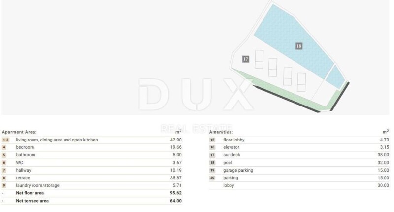 OPATIJA, CENTER - luxurious apartment in a special new building above the center of Opatija with a swimming pool and a garage. We offer an opportunity to make your dreams come true. The effort and knowledge of top local architects once again showed a quality result. A special building with a total of 5 luxury apartments is located slightly uphill, 200 meters as the crow flies from the center of Opatija. This architectural masterpiece is located on a plot of 1,000 m2 in a quiet residential area surrounded by the forests of Opatija and exclusive buildings. Apartment 1, size 95.62 m2, is located on the ground floor of the building and consists of a hallway, a large bedroom 20 m2, bathroom, toilet, laundry room, living room with kitchen + dining room 43 m2 and a private terrace 36 m2 with access to the building's swimming pool and its sun deck. The apartment is for sale, turnkey, including a bathroom with sanitary facilities, - ready for furniture. Some of the important characteristics of this building are: - high-quality, open carpentry, glass walls that guarantee an open view of the sea and the roofs of Opatija's historic villas - underfloor heating + heat pump - branded materials and sanitary ware in the bathrooms - outdoor heated pool - underground garage and garage space - elevator - integrated cooling - energy-efficient construction, sustainability A truly fantastic investment opportunity in Opatija - a combination of timeless architecture, modern luxury atmosphere and modern home technology. The air distance to the sea or the Lungomare promenade is 450 meters or 4 minutes on foot downhill. Driving by car or motorbike takes only one minute. The planned completion of the works, i.e. the occupancy of the building, is at the end of 2024. Contact an agent with confidence. Dear clients, the agency commission is charged in accordance with the General Terms and Conditions. www.dux-nekretnine.hr/opci-uvjeti-poslovanja Marko Šutanovac Agent s licencom E- www.dux-opatija.com Marco Matešković Agent s licencom E- www.dux-nekretnine.hr OPATIJA, CENTER - luxurious apartment in a special new building above the center of Opatija with a swimming pool and garage.