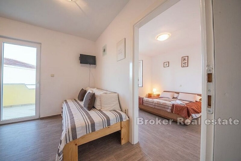 House in an excellent position, first row to the sea, located in a quiet environment 20 kilometers from the city of Zadar. The house belongs to a semi-detached house, consists of 3 apartments spread over two floors, ground floor and first floor. The ground floor is arranged as one apartment, which includes a kitchen, bathroom and two bedrooms, while on the 1st floor the space is divided into two apartments, symmetrical floor plan with a total of two kitchens, two bedrooms, two bathrooms, balcony and terrace. The apartments on the 1st floor are accessed by an external staircase. In front of the house there is a parking lot with 3 parking spaces and an outdoor grill, while on the other side of the house this position is adorned with a beautiful beach only 20 meters away. Extremely attractive quiet location, overlooking the sea, close to all necessary facilities from shops, pharmacies, restaurants, bars to beautiful beaches. The house can be used as 3 separate residential units, for private or tourist purposes, it can also be converted into a single residential building suitable for year-round living.
