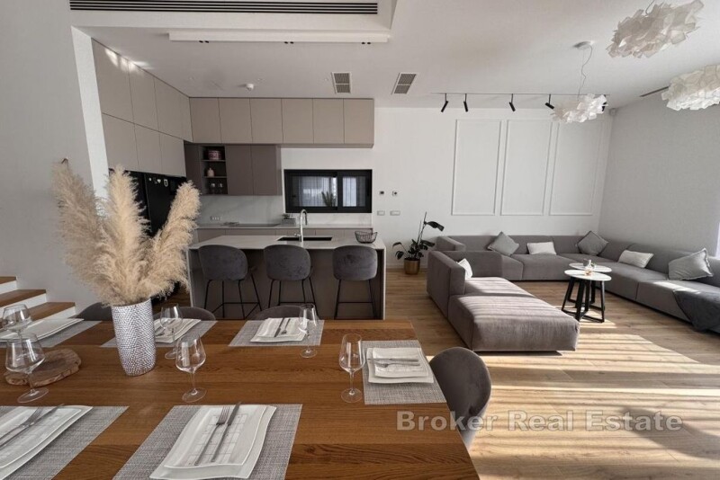 A luxurious newly built villa located in an attractive location, just a few kilometers from Split, offers spectacular open sea views. It is located on a plot of 894m2, spread over three floors with a total living area of 223m2. In the basement there is a garage and additional space that can be adapted to the wishes of the future owner (e.g. a recreation room/entertainment room, etc.). For complete comfort, three parking spaces are available in the yard. The ground floor at the height of the first floor is an open concept space. There is a spacious living room, large kitchen and dining room. A guest bedroom, bathroom and additional storage room are located on this floor. The exit to the spacious terrace with a heated pool and sundeck is located on the mezzanine. From the pool you can see the entire city of Split in the palm of your hand. Also in the yard there is a “summer kitchen” that is used for socializing, all in sliding walls. Behind the villa there is a beautiful garden intended for children to play, but also to rest in the shade during the hot summer months. On the top floor there are 4 spacious bedrooms, two bathrooms and a large terrace. Surrounded by a garden full of Mediterranean flora, the property is an ideal example of modern architecture with clean lines that fits perfectly into the Dalmatian stone and karst on the slopes of the mountain with an open view of the sea. Its location offers maximum privacy, with all necessary facilities a few minutes away by car. It is sold fully furnished. It is ideal as an investment with huge potential for tourist rental. The Archaeological Park of Salona is 3 km away, while the center of Split is 11 km away. Split Airport is 21 km from the property.