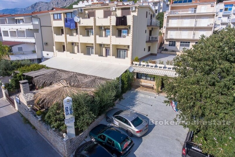 Interesting investment in hotel business, in a tourist village Nemira, only a few kilometers away from Omis. The facility consists of ground floor and three floors. On the ground floor is a spacious restaurant with a 160 seats divided into indoor and outdoor part, with its bar and three toiletes, additional extra room for dining in case of need, a large kitchen, fully equipped and decorated, area with indoor pool, an area with equipment for gym and fitness, as well as additional facilities such as a pantry in the kitchen, cloakroom and toilet for staff, showers for users of the pool, two additional toiletes, smaller reception etc. The first floor has 8 rooms, three of which are double (6 beds), and 4 are double with optional extra bed per room (12 beds) and one room for personnel. On the second floor there are 4 double rooms (8 beds) and 4 double rooms with extra bed (12 beds). On the third floor there are two double rooms with two extra beds (8 beds), one spacious family room with 4 beds, and another double room (2 beds). On the third floor there is also a private apartment with two bedrooms, living room, kitchen, bathroom and balcony. All together, the facility has 20 rooms, ie 52 beds. Each room has a balcony and a sea view and all have been completely equipped and furnished and have been rented for many years. The property is in excellent condition, the installations have been completely changed 8 years ago, and the facility itself is very well maintained up to smallest details. In addition to this, the property has a total of 17 parking spaces, with 8 places in front of the building and 9 places behind the object. This property is 200 meters from the sea, we find as advantage, because there is no noise from the beach, which is good for the guests, and on the other hand, the beautiful beaches are in only two minutes walking distance from the house, so that most guests spend the whole day on the beach and relax on the balcony, restaurant or pool during the night. This tourist facility is already 20 years constantly record great results through a rental, and a large number of “old” guests, in love with this part of the Adriatic coast, which found in this offer everything they need for a family vacation, as well as the beautiful city of Omis which provides many additional facilities, ranging from numerous different restaurants, events, and strong excursion and sports offerings that are expanded every year with additional amenities. The property with its asking price covers investment for a period of 15 years, with additional potential for the development of a restaurant offer, considering the number of seats (one of the largest restaurants in this area in general) and the potential that this restaurant has. Very interesting offer on this part of the coast, which guests from Central Europe most prefer, and are always happy to return next summer.