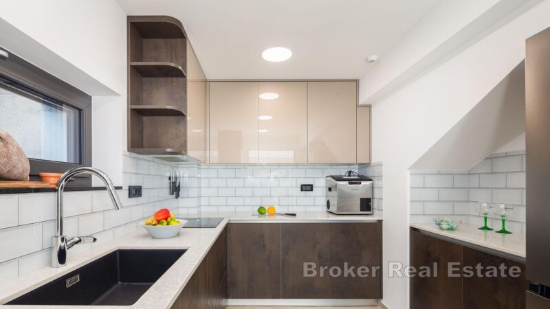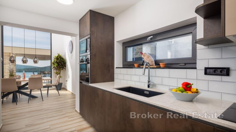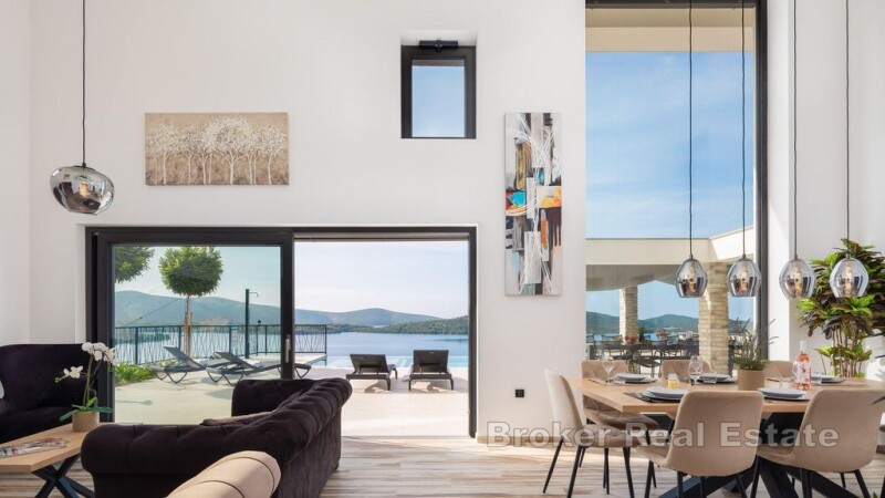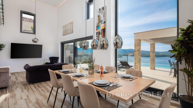 A luxurious villa near Šibenik is for sale, located just 150 meters from the sea coast. The property also includes auxiliary buildings, and the sale includes one building plot and one agricultural plot opposite the main parcel. The main house spans three floors. The basement features a spacious 25.57 m² game room, a staircase measuring 10.71 m², a 6.27 m² kitchen, a 2.09 m² pantry, a dining area and living room combined into an open space totaling 32.64 m², and a 12.87 m² lounge. The basement leads to an uncovered terrace offering generous outdoor enjoyment, spanning 83.95 m². The ground floor includes a 3.63 m² entrance loggia, an 8.29 m² boiler/storage room, an 8.29 m² external storage area, a 3.90 m² entrance space, a 14.40 m² staircase, a 4.20 m² laundry room, a 4.14 m² WC, a 4.93 m² sauna anteroom, a 3.52 m² sauna, and a 1.56 m² gallery. This floor is designed for added comfort and practicality for daily needs. The first floor houses four bedrooms, each measuring 18.89 m² and 15.75 m², each with its own bathroom measuring 4.56 m² and 4.37 m². Each bedroom offers comfort and privacy, making this floor ideal for a peaceful and relaxing stay. Additional buildings and amenities include a summer kitchen with a barbecue area measuring 10.06 m², perfect for outdoor meals and gatherings. A 54.11 m² pool provides refreshment and entertainment during the summer months. There is also pool equipment covering 7.91 m². The auxiliary building, a fully equipped 49.50 m² apartment, includes a kitchen and dining area for four people, a living room, a bedroom, and a bathroom. The total gross building area of the main house and auxiliary buildings is 360.75 m², excluding additional facilities. Additional amenities include a paved terrace around the pool measuring 140 m², a playground with equipment spanning 130 m², a football/volleyball court with artificial turf, fully fenced, measuring 162 m², and six landscaped parking spaces in front of the property. This exclusive property offers the perfect blend of luxury, comfort, and recreation, ideal for family living or as an investment for tourism purposes. All buildings and amenities are carefully designed to provide maximum comfort and enjoyment.