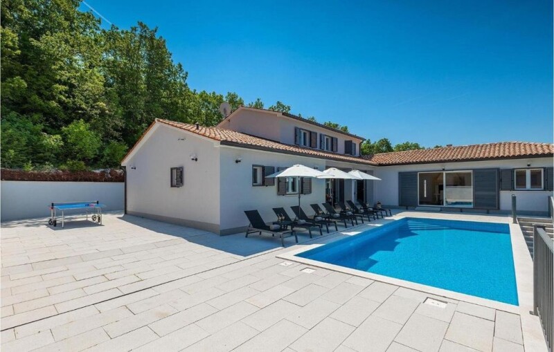 Location: Labin Built: 2021 City center: 3.5 km Sea: 9 km Airport distance: 42 km Inside space: 249 m2 Plot size: 1406 m2 Bedrooms: 4 Bathrooms: 5 Swimming pool: 38 m2 Parking: 3 Air-conditioner Patio Playground Garden.