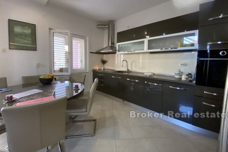 Spacious, decorated house in an attractive location, surrounded by smaller family houses. It is located in an exceptional position, close to the dynamic city center. The house has approximately 517 m2 of gross living space, which is spread over three floors. The basement floor consists of a tavern, a space designed as a place for socializing and relaxation with a toilet (summer kitchen) and a space that can have a different purpose depending on the wishes of the owner (garage, office space, apartment) On the ground floor there is a spacious four bedroom apartment and two furnished studio apartments with separate entrances. The apartment consists of an entrance hall, living room with open plan kitchen and dining room, four bedrooms, bathroom with toilet and a spacious terrace. The first floor is divided into two apartments of identical layout and decoration, of which one is two-bedroom and one one-bedroom. On the first floor there are also two studio apartments (rooms with bathroom) with separate entrances and two spacious terraces that offer a beautiful view of the sea and the old town. The house is surrounded by a landscaped and fenced yard of approximately 470 m2, with barbecue, space for dinners and socializing, a garden with planted citrus fruits and landscaped Dalmatian horticulture. In the immediate vicinity there are beaches, shops, bars, restaurants and many other tourist facilities that allow a carefree vacation.