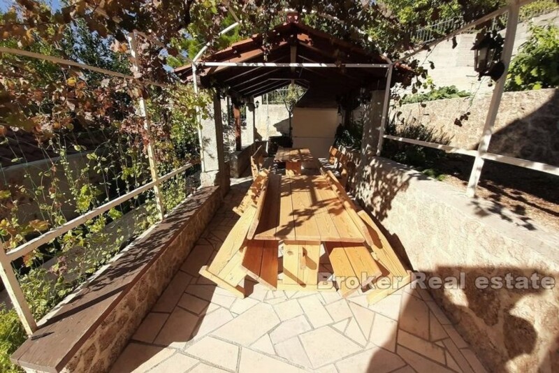 Detached house with sea view, for sale, located on the Omis Riviera in the second row by the sea, total living area of 240 m2, located on a plot of 289 m2. The house consists of a ground floor and two floors, with a total of 4 apartments and a tavern on the ground floor. On each floor (connected by an internal staircase) there is one one-bedroom apartment, while the fourth apartment has a separate entrance from the back of the house and this apartment is the largest. All apartments have access to a terrace overlooking the sea, which is 35 meters from the house. The house also has a garden and an outdoor terrace with a fireplace and a space for socializing. In addition to the above, the price includes 300 m2 of parking located on the main road, from where the house is accessed by stairs leading to the sea. There are only a few neighbors in the area so the house is positioned in a fairly quiet place. A very interesting opportunity for a tourist rental business, while the interior space can be expanded by connecting the apartment into a larger whole. The house is neatly maintained and in good condition. The house also has a preliminary design for the installation of a swimming pool in the garden area, which would ideally complete this interesting offer.