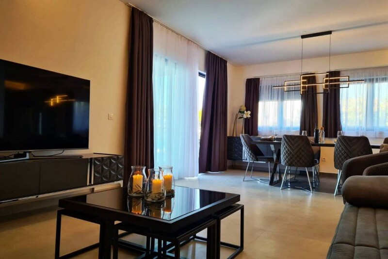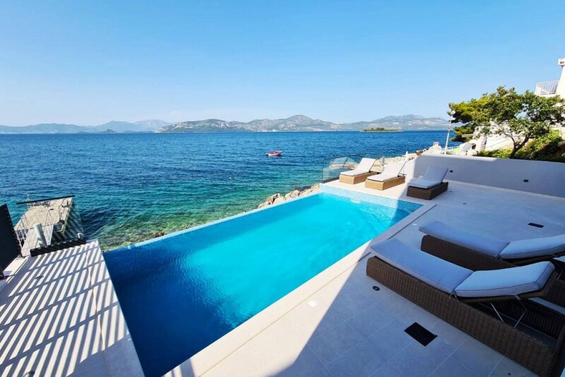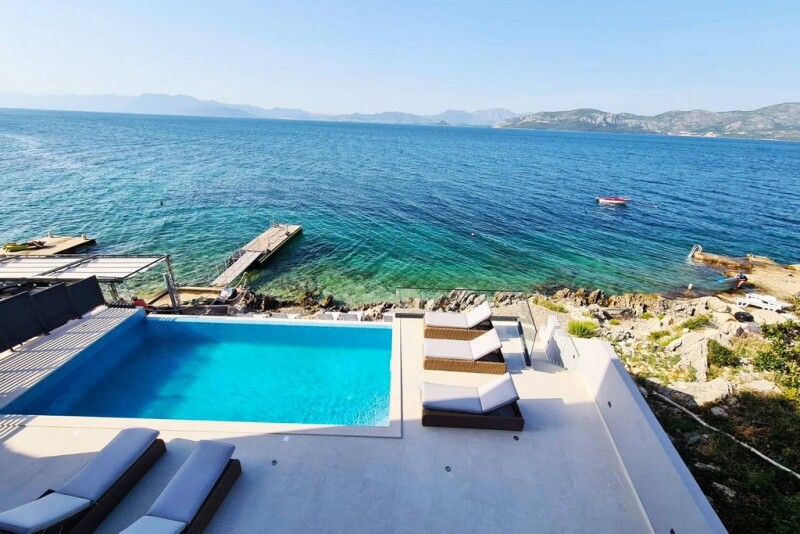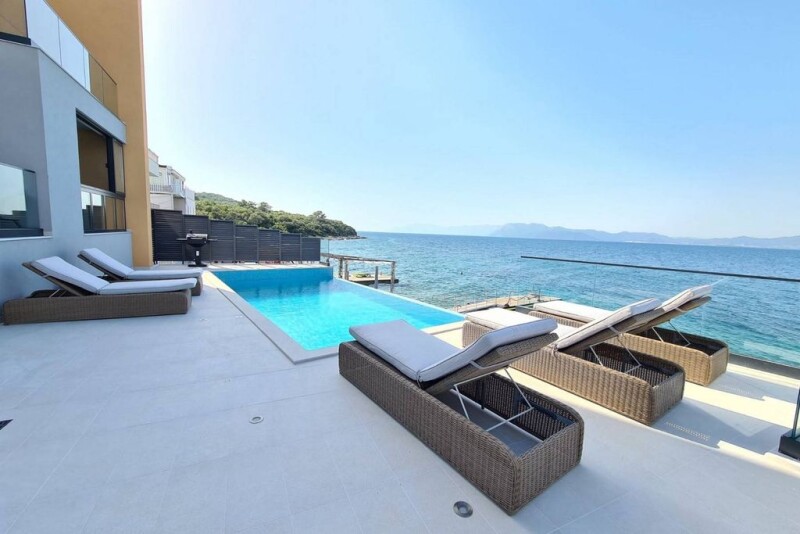 Villa Incatesima is a newly built luxury seafront property situated in an attractive and quiet location in a small fishing village on the Pelješac peninsula. Pelješac is widely known for its divine beaches, crystal clear sea, and captivating landscape that offers complete peace even during the summer. At the same time, rich gastronomy and wines from the best Croatian wineries will captivate your taste buds. Villa Incantesima is set on a 485 m2 plot and extends to 440 m2 of living space, elegantly distributed over 3 floors. The basement consists of an entertainment room with a pool table, a tennis table, a foosball table, lounge area with a TV and is ideal for gatherings with family and friends. A fully equipped gym is also situated on this floor. The open-concept ground floor consists of a modern kitchen equipped with high-end appliances, a dining room with a table for 12 people, and a spacious living room that opens to the covered terrace with a spectacular sea view through glass walls while the stairs lead to a sunbathing area with a swimming pool. There is also a whirlpool tub and a sauna on the ground floor for extra comfort. Internal stairs lead to the upper two floors, with 6 elegant bedrooms, each with a bathroom. The well-maintained Mediterranean garden and attractive swimming pool are ideal for soaking up the view and enjoying the refreshing natural ambiance, often complemented by picturesque sunsets. The villa also has secured parking spaces for several vehicles. Villa Incantesima is sold fully furnished and ready to move into. The perfect combination of a prestigious location by the sea and a pebble beach, quality construction, top-quality equipment, elegance, luxury facilities, proximity to Dubrovnik, and the international airport makes this villa ideal for all who want to enjoy an easy-going lifestyle by the sea. At the same time, it represents an exceptional and rare investment opportunity, especially considering the property’s tourist potential.