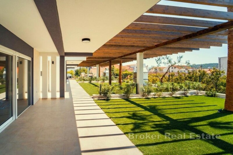 This modern two-story property is located in an excellent location near the center of Trogir. It consists of two floors with a total living area of 112 m². The property is an ideal choice for those looking for a comfortable living space close to all key facilities. The property consists of a functional entrance leading to spacious and bright rooms. On the ground floor there is a fully equipped modern kitchen with a dining area, and a living room with access to a furnished terrace with a total area of 20 m2, where there is a barbecue. Internal staircase void to the first floor level where there are two comfortable bedrooms, offering enough space for family or guests. The bedrooms are modernly decorated, with enough natural light, which contributes to the overall ambience for rest and relaxation, and at the same time they also have access to a covered balcony. On the same floor, there are two more bathrooms, fully equipped and furnished, providing everything needed for everyday use. The property is sold fully furnished and equipped, which makes it perfect for immediate occupancy or as an investment for further rental. All furniture, appliances and decorative elements have been carefully selected to create a harmonious and modern interior that meets high standards of comfort and style. Parking is available next to the property, which is a significant advantage in densely populated urban areas such as Trogir. The location of the apartment near the city center makes it an ideal choice for those who want to solve the housing issue, but also for investors who are looking for real estate with the potential for short-term or long-term rental. The proximity to the city center allows easy access to all important facilities, including shops, restaurants, schools, kindergartens, pharmacies, as well as the famous historical sights of Trogir, which is under the protection of UNESCO. This makes the apartment a perfect choice for those who want to enjoy all the benefits of urban life with the comfort and peace of their own home.