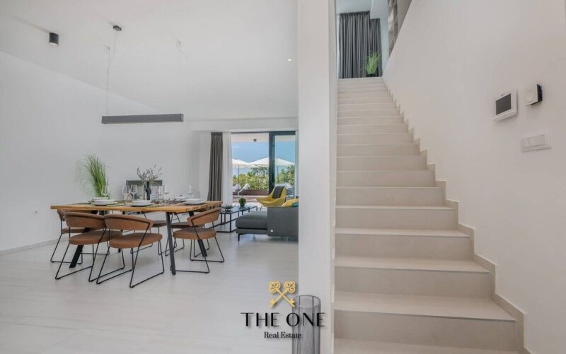 Modern luxury semi-detached villa with a pool is located on a hill above Opatija with a breathtaking view of the Kvarner Bay and Mount Učka. On the ground floor of the villa there is a spacious, open living and dining room with a modern kitchen and pantry, ideal for social meals. The master bedroom with its own bathroom and direct access to the garden is located in the back of the ground floor. The outdoor and indoor spaces are perfectly connected thanks to the large glass doors. On the covered part of the terrace there is a lounge area, and a heated swimming pool surrounded by a sunbathing area. A beautifully landscaped garden with Mediterranean plants, trees and palm trees also adds to the atmosphere. On the first floor, there is an additional living room with access to a covered balcony with a spectacular view of the sea. Two comfortable bedrooms, each with its own bathroom, are also located on the first floor and offer a private view of the back garden. In the basement of the villa there is a garage, storage rooms and a machine room. All rooms have underfloor heating with a heat pump, as well as a fan coil system for optimal temperature throughout the year. The villa is fully furnished, decorated and ready to move in and is sold as is. Also, privacy and security are ensured since it is located in a private street with an electric entrance gate. The property offers the perfect balance between luxury and nature, ideal for those looking for peace and relaxation in the immediate vicinity of Opatija, the oldest and most attractive tourist resort in the northern Adriatic. The villa is owned by a legal entity, and the buyer is exempt from paying real estate sales tax. In the case of a purchase by a legal entity, a VAT refund is possible after the sale. Not what you’re looking for? Contact us for a personalized approach, and discreet, bespoke property finding service. THE ONE E- www.theone.hr THE ONE Real Estate E- www.theone.hr Modern villa with a sea view in a gated community, Opatija Riviera.