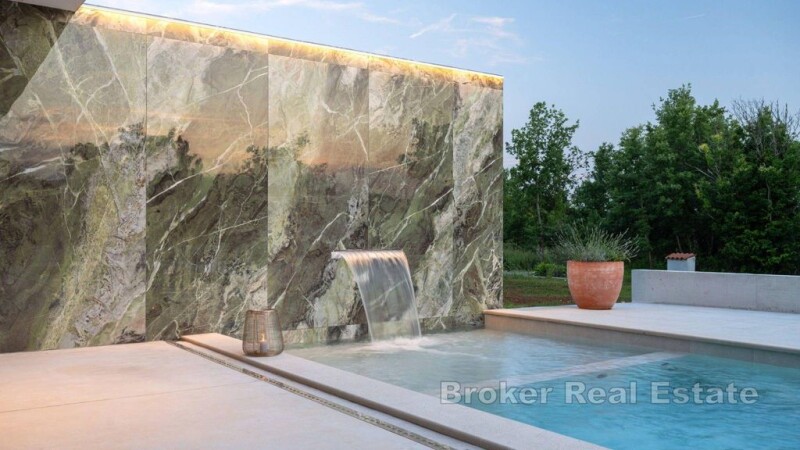 For sale is a modern, newly built villa located in central Istria, which offers a perfect combination of comfort and natural beauty. This property is spread over two floors with a total living area of 300 m², located on a plot of land of 2170 m². The ground floor of this villa is open concept. It consists of a modern living room, fully equipped kitchen and dining room. The ground floor stands out with its large sliding glass doors that provide plenty of natural light. This floor also has a guest toilet, a laundry room with access inside and outside the house and a boiler room with an outside entrance. The internal staircase leads to the first floor, the second and the last floor. This floor consists of three bedrooms, each with its own bathroom and access to a large covered terrace. In the fully landscaped yard of this villa, there is a 61 m2 swimming pool with a sun deck. There is also a covered part in the yard with a summer kitchen and dining room. The uncovered part with the sun deck covers an area of 160 m², while the covered part covers an area of 222 m². The property also has four outdoor parking spaces. The yard of this property has a spacious 2,170 m² and thus leaves the future owners with the possibility of building a garage. This property is an ideal choice for those who want to enjoy untouched nature, but due to the close proximity of many facilities such as shops, cafes and restaurants, it is also perfect for year-round living. It is 17 kilometers away from the sea.