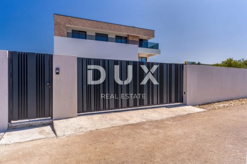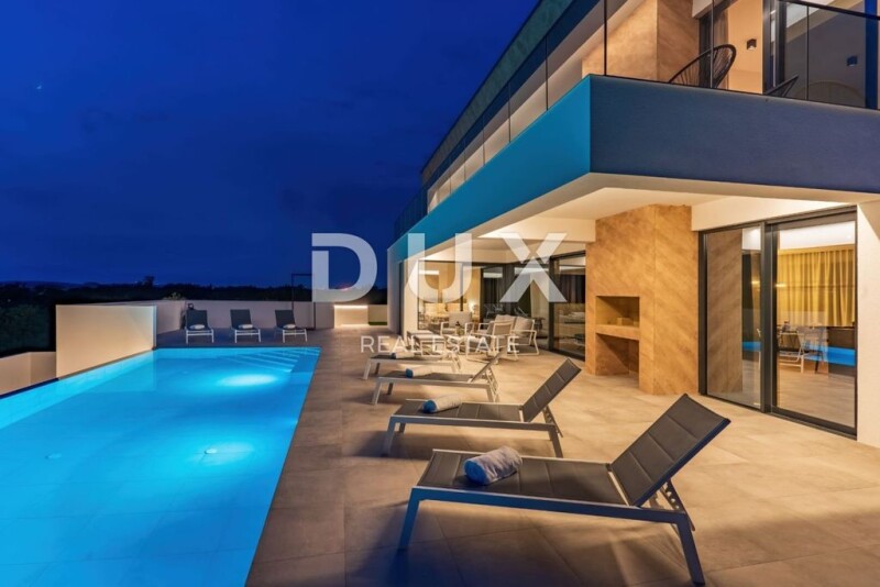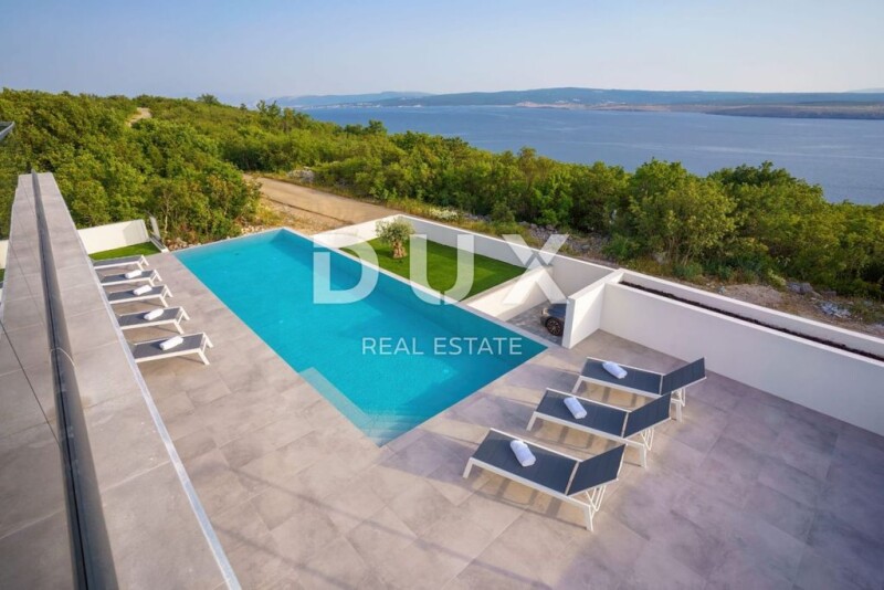 CRIKVENICA, JADRANOVO - Modernly designed villa with panoramic sea view Modern villa located on a large plot, surrounded by an olive grove, a green belt and with a panoramic view of the sea. The villa extends over three floors. In the basement there is a garage for two cars with a charging station for electric vehicles, an entertainment room (family cinema, table tennis), a wellness area, additional storage and a boiler room. The ground floor of the villa can be accessed from the outside or by an internal staircase. The ground floor is a spacious area consisting of one bedroom with bathroom, guest toilet and "open-space" living room with kitchen and dining room. A large glass wall connects the interior space with the outdoor terrace and loggia dominated by the 4.5x12 meter infinity pool. From the terrace there is an impressive view of Kvarner and the sea. On the first floor, there are three bedrooms with private bathrooms and exits to the terrace, and two have their own "utility"/wardrobe. The villa is oriented southeast and is sunny all day. The living area of the house is 380 m2 with over 200 m2 of residential terraces (loggia, balcony, lounge). The house has floor heating and cooling of the house via heat pumps, the floors are partly vinyl and partly high-quality ceramic, as well as the pool. The height of the ground floor is 3 m, which gives the villa a special luxury. The yard of the villa is fenced, behind it is an olive grove with young olive trees, it is fully furnished and is being sold as such. *** Dear clients, the agency commission is charged in accordance with the General Terms and Conditions www.dux-nekretnine.hr/opci-uvjeti-poslovanja Iva Mršić Agent s licencom E- www.dux-krk.com CRIKVENICA, JADRANOVO - Modernly designed villa with panoramic sea view.