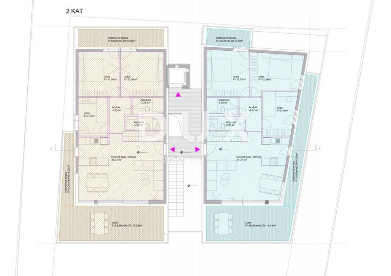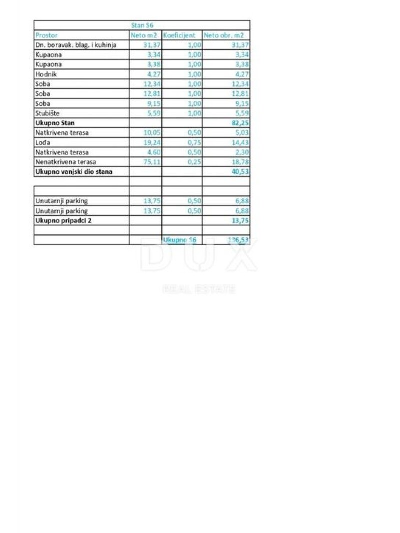 ZADAR, DIKLOVAC - Modern penthouse with garage under construction S6 A modern penthouse under construction in Diklovac in Zadar is for sale. The apartment with a total living area of 82.25 m2 is located on the second floor of a smaller residential building with 6 units. It consists of a spacious living room, kitchen and dining room, three bedrooms and two bathrooms. The apartment has a terrace, a loggia, a roof terrace of 75.11 m2, a storage room and two garage parking spaces. The total usable area of the apartment together with all accessories is 136.53 m2. The apartment is fully air-conditioned and has underfloor heating. High-quality materials were used in the construction, such as reinforced concrete construction and 12-16 cm thermal insulation on the facade. First-class ceramics were used for the floor coverings, and the rooms have three-layer parquet. The carpentry is aluminum, and electric blinds, mosquito nets and reflective glass are installed. The building has an elevator and an underground garage. The planned construction date is mid-2025. The apartment is positioned in a very quiet location, 400 m from the beach. The city center is less than 4 km away. In the immediate vicinity there is a variety of content such as restaurants and shops. Zadar is the urban and tourist center of Northern Dalmatia, a city that, in addition to its long history and cultural diversity, also offers a rich gastronomic offer. There are various interesting places in the vicinity of Zadar, such as the historical towns of Biograd na Moru or Nin, and numerous islands on the Adriatic coast. Dear clients, the agency commission is charged in accordance with the General Business Conditions www.dux-nekretnine.hr/opci-uvjeti-poslovanja Sara Večeralo Agent s licencom E- www.dux-dalmacija.com ZADAR, DIKLOVAC - Modern penthouse with garage under construction S6.
