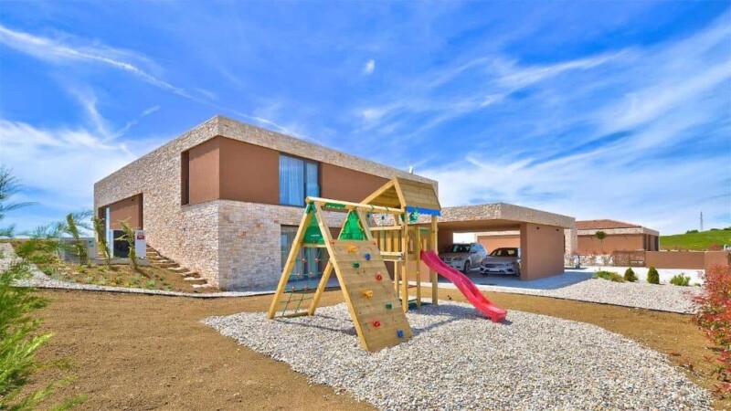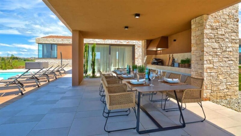 The Stone Mansion near Umag is a stunning property located just 5 km from the city center of Umag. This magnificent mansion was built in 2018 and offers a truly luxurious living experience. With a spacious inside area of 375 m2 and a large plot size of 1986 m2, this property has plenty of room for residents to relax and unwind. The mansion features 6 bedrooms and 6 bathrooms, making it perfect for a large family or group of friends. Each bedroom is beautifully designed and decorated, ensuring that residents can enjoy a comfortable and stylish living space. The property also boasts a 48 m2 swimming pool, perfect for cooling off on hot summer days. In addition to the stunning living spaces, the Stone Mansion near Umag also offers a range of amenities to ensure that residents have everything they need for a luxurious lifestyle. The property has parking for 2 cars, as well as air-conditioning throughout to keep residents cool and comfortable. For added security, the mansion is equipped with cameras, ensuring that residents can relax knowing that their home is safe and secure. The outdoor spaces at the Stone Mansion near Umag are equally impressive, with a spacious patio area perfect for al fresco dining and entertaining. The property also boasts a playground for younger residents to enjoy, as well as a beautifully landscaped garden. Whether residents are looking for a peaceful retreat or a luxurious home for entertaining, the Stone Mansion near Umag offers the perfect blend of comfort and style. With its prime location just 7 km from the sea and 76 km from the nearest airport, this property truly offers the best of both worlds. Experience the beauty and luxury of English language living at the Stone Mansion near Umag.