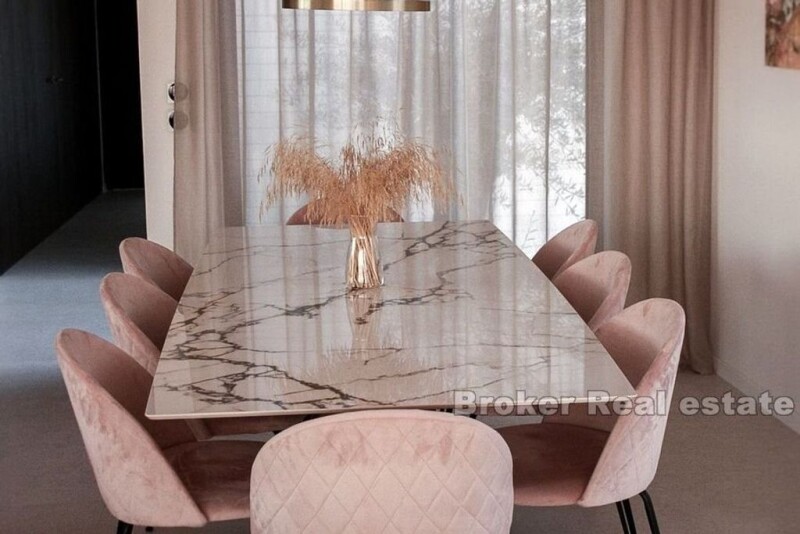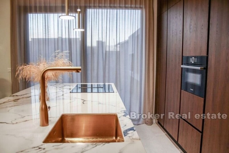 Modern villa located in a very quiet and prestigious location with open sea views. House with a total living area of 316 m2 with an overflow pool on a plot of 812 m2. It consists of three modernly equipped floors, and was built in 2021. On the first floor there is an entrance with fitted wardrobes, one bathroom, a spacious living room which is connected to the outdoor area by the pool by sliding glass walls, a kitchen and a dining room. On the second floor there are two bedrooms of 20m2 with an open closet concept and large windows, each with its own bathroom and a common large balcony facing the sea from which there is an amazing view. On the third floor there is a master bedroom that has its own walk in closet and a bathroom that is connected to itself by glass, designed so that after a hard day you can watch the sunset from your own sparkling bath. Each room has a sea view and its own air conditioning, and the bathrooms are underfloor heating. The parquet in the rooms is three-layer, high-quality, bleached Class I oak. Due to the atmosphere in winter, the living area has a large Lenordica fireplace, built-in floor air conditioning and underfloor heating. In the central part of the property there is an olive tree over 60 years old, glazed so that it fits into the living space as a work of art. The villa is for sale fully furnished. All the furniture is made to measure and additionally equipped with designer pieces, the paintings on the walls are the work of art of a local artist. All devices are Bosch, the sanitary ware is gilded, Grohe brand. The table and the surface of the kitchen island are made to order from marble and quartz in order to be as durable and resistant as possible. Additional appliances in the kitchen include a large wine cooler and ice maker. There are also solar panels on the property, and a robot for cleaning large glazed areas comes with the house. The Infinity pool can also be used in the winter months as it comes with built-in heaters. The 50x3m long external stone wall is handmade from Dalmatian stone according to the drywall principle, the stone has excellent properties and is resistant to external conditions. In the outer courtyard there is also a large barbecue with space for relaxation and socializing. The intercom can be connected to a mobile phone so no key is required. The property is covered by surveillance cameras, and the property has 4 parking spaces. It is 650 meters away from the sea, located in an urban area around Split in a quiet neighborhood. It is 12 km away from Split, in the immediate vicinity there are shops, pharmacy, cafes, beach. It is an ideal investment if you want a perfectly carefully designed property in which a lot of effort and love has been invested to the last detail, so that it can be used for life but also for tourist rentals in the summer months.