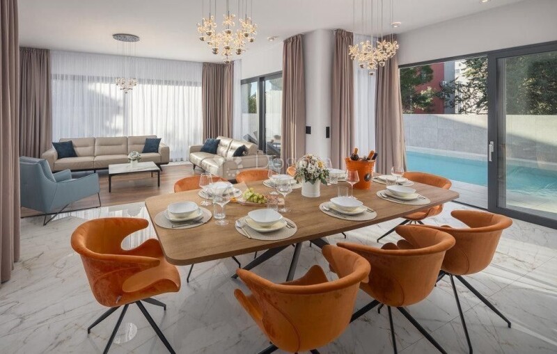 The dream villa is located in the beautiful surroundings of Zambatrija, only 300 meters from the sandy beach. This extraordinary villa provides the ultimate experience of luxury and comfort. The total net living area is 250 square meters, and during the construction the owners used the most modern materials and the most modern technology (Miele, Swarovski, etc.). Each room has its own bathroom, the kitchen is equipped with the most modern appliances, and the dining room and living room are connected to an outdoor terrace with a heated pool and Jacuzzi. It is in the villa, with cooling and several types of heating, so it can be enjoyed all year round. If you lead a healthy and active life, this is the right place for you. In addition to the heated pool and outdoor jacuzzi, you can also keep in shape in the small fitness center within the villa, and the environment is ideal for long walks, running or cycling. For more information, contact us with full confidence. Darko Jurčec 00385 98 268 061 darko. jurcec@dogma-nekretnine.com.