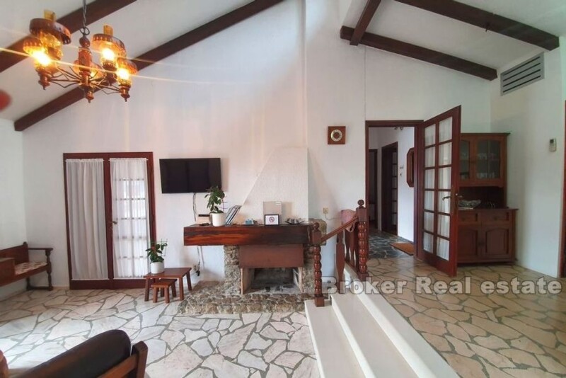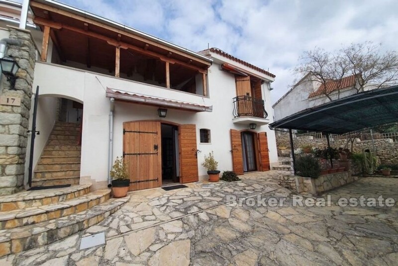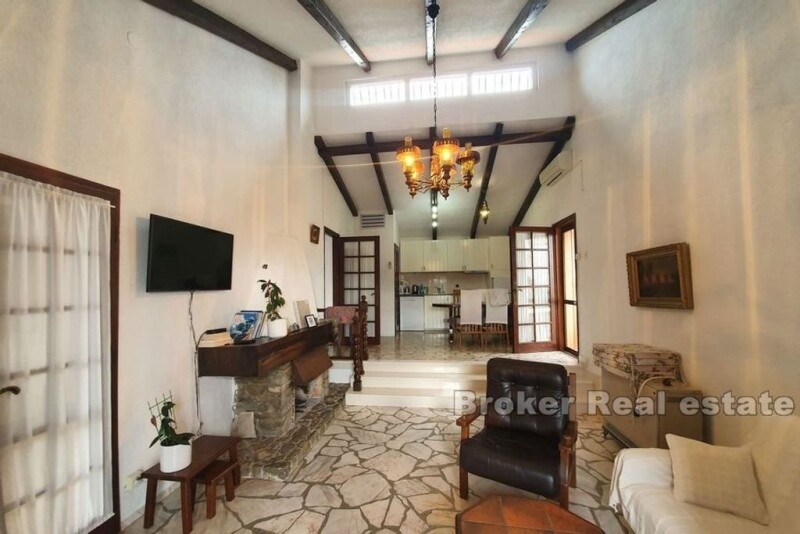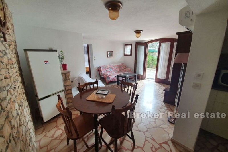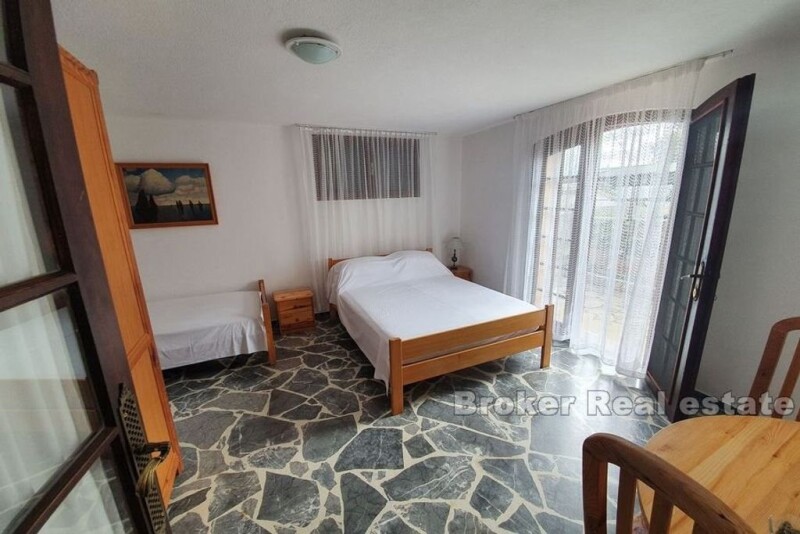 Interesting, detached house, located in a small, tourist-attractive place not far from the town of Trogir. The house was built on a plot of 704m2. It consists of two floors (162m2) with three residential units, two auxiliary buildings of 59m2, garage, parking for three vehicles, terrace overlooking the sea and a garden with Mediterranean plants and olive trees. On the first floor on the left side of the house, there is a garage with an additional room that can serve as a storage room. On the right side is a one bedroom apartment. On the second floor of the house there are two apartments and a terrace of 24m2 with a sea view. One apartment is a duplex, which gives it a special charm. The second apartment has access to a balcony and an east terrace with an auxiliary room where the barbecue is located. All apartments consist of a kitchen with dining area, living room, bathroom and one bedroom. The house is ideal for living as well as for tourist rental. The beach is only 70m away, Split airport 10km and the city of Trogir 5km.