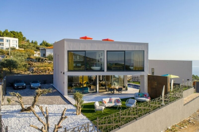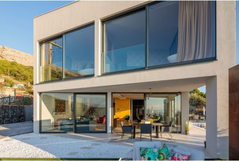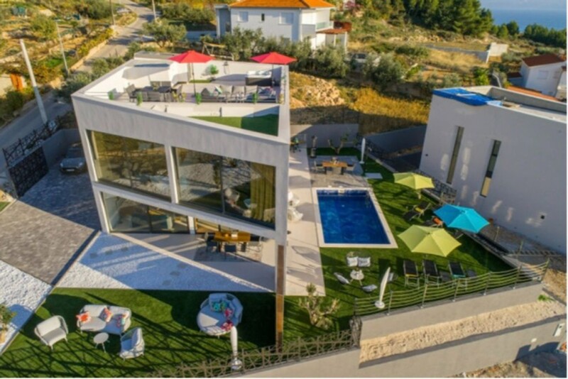 We are selling a beautiful newly built villa in the vicinity of Split, upper Podstrana. The beautiful villa is located in a quiet area of Podstrana, surrounded by green nature and other villas. It is 400m from the sea and offers a stunning panoramic view of the sea, the islands of Hvar and Brač, and Split. The orientation is south and offers on one side a beautiful view of the sea and on the other side a view of the green forest. The villa of solid luxury reinforced concrete construction and 10 cm thermal facade was built according to the highest standards in 2020 and the materials are of German, Austrian and Italian origin. The villa consists of ground floor, first floor, rooftop, terrace with pool and yard. There are outdoor parking spaces behind the villa. The ground floor covers an area of 100m2 and consists of a kitchen, living room, pantry, guest toilet and is equipped with underfloor heating and LED design lighting. The first floor consists of 3 bedrooms with bathrooms, two bathtubs in the bedroom, a laundry room and a guest toilet. It is equipped with three floor air conditioners, built-in wardrobes up to the ceiling barrier and underfloor heating. The rooftop is equipped with a whirlpool, TV and internet connection and LED design lighting. The villa also has a technical room equipped with pool technology/salt electrolysis for pool cleaning and a pool robot, a 750 liter fresh water tank, a 300 liter hot water boiler and a central vacuum system. Particularly attractive are the open hallway with designer tiles in the Italian style and oversized windows throughout the villa that provide a lot of light to the interior of the villa. In addition, the villa has a connection for an e-car connection, cameras and an alarm system. In front of the villa there is a large terrace with a swimming pool and a landscaped yard. It is located in the concept of 5 villas and is currently an identical villa under construction. The buyer pays an agency commission of 3% + VAT. For more information, call the number: +385 99 497 56 74-Martina. Viewing the property is only possible with a signed Brokerage Agreement, which is in accordance with the Data Protection Act and the Act on Brokerage and Real Estate Transactions.