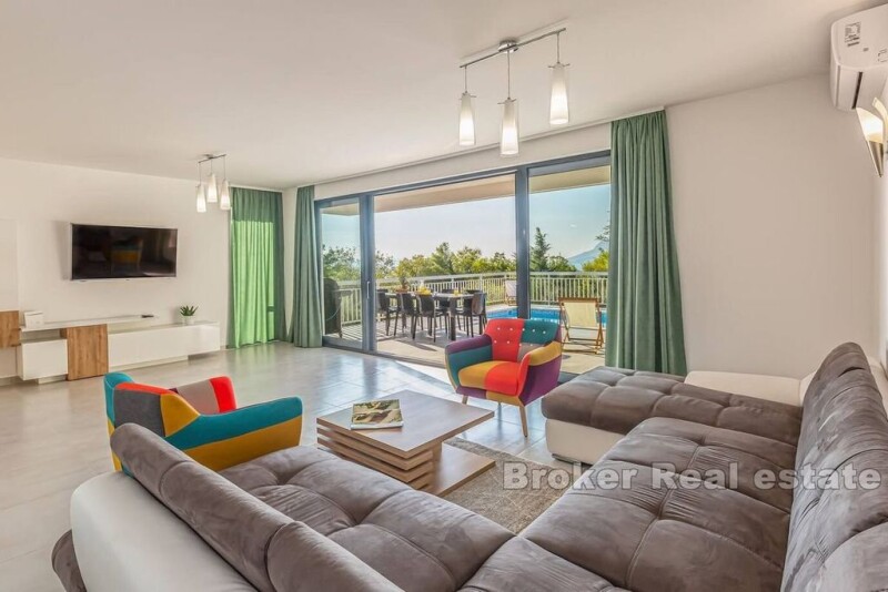 Makarska, villa of modern architecture with swimming pool, view of the sea and nature. The villa is located at the foot of the Biokovo mountain, in a cultivated environment, on a gentle hill that offers a view of the sea from all its areas. On its surface of 350m2, it extends over 4 floors: – In the basement there is a room for pool equipment and a large garage space for a large number of cars. – There is a large two-story apartment on the ground floor and first floor. The lower floor consists of a modern living room, kitchen and dining room, toilet and outdoor terrace with swimming pool and sunbathing area. Already from this ground floor there is a wonderful view of the sea and the mountains. The upper floor, which is reached by an internal stone staircase, consists of 3 large bedrooms with private bathrooms and a balcony – The 2nd floor is a separate apartment, with a separate external entrance, consisting of a large bedroom, an additional bathroom, a living room and a partially covered large terrace of 35 m2 with a dining area and a jacuzzi. The villa is of modern architecture and meets all the criteria of modern life. Its attractive natural environment, proximity to the beach with crystal clear sea, as well as proximity to all facilities, shops and restaurants, give it a special value.
