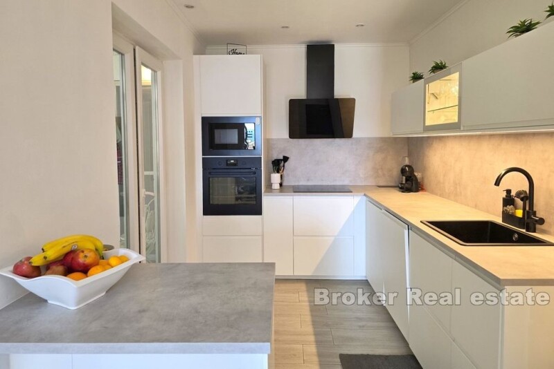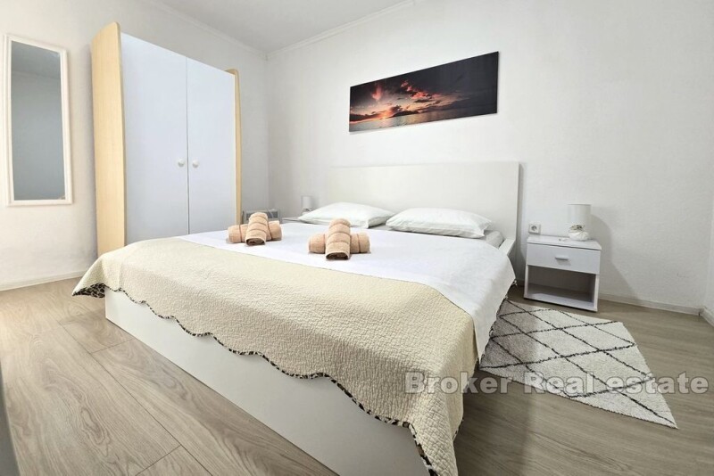 Semi-detached apartment house located in a small tourist town not far from Omiš, in the second row to the sea. The house consists of two floors with a total gross area of 273 m2, and is built on a plot of land of 342 m2. On the ground floor there is a spacious apartment with three bedrooms, a living room, a kitchen with a dining room, an additional bathroom and access to the terrace. There are two one-room apartments and one studio apartment on the first floor. Each apartment has its own decorated terrace. All apartments are air-conditioned. The yard consists of a parking lot and a garden with a tavern with a gross area of 14 m2 and a barbecue. The house is sold furnished and ready to move into. The exterior of the house requires additional investment in the form of a new facade, and there is a possibility of upgrading with an additional floor. Thanks to its extremely accessible location near the beach and all key amenities, this property is ideal for use for tourist purposes, but also for comfortable year-round living.