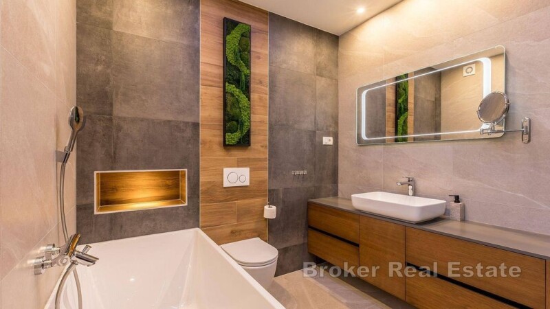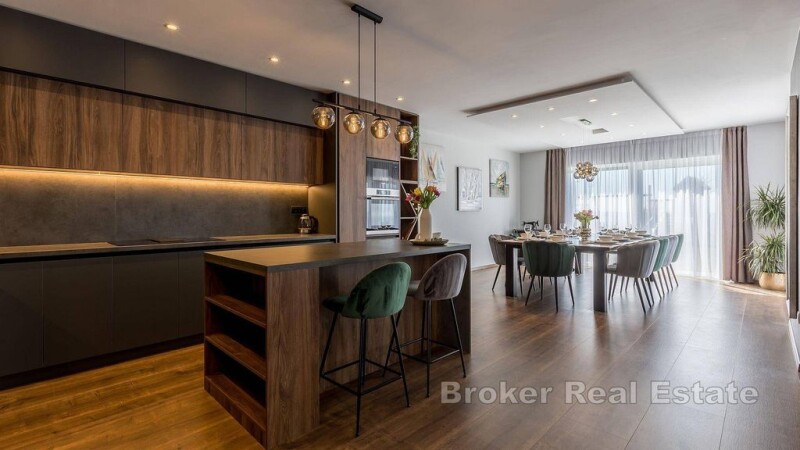 A beautiful modern villa with an enchanting panoramic view of the sea and islands is for sale. On a total of three floors, it consists of a spacious living room, kitchen and dining room, two bathrooms, five bedrooms, of which the master bedroom has a private terrace and a separate bathroom. Floor-to-ceiling windows really emphasize the view outside and ensure that the rooms are flooded with natural light. Modern furniture and good equipment make this property an ideal place for a relaxing holiday. The villa's terrace offers a beautiful panoramic view of the sea. In front of the villa there is also a swimming pool that offers refreshment on hot days, a sunbathing area and a children's playground. The garden is fenced, so you can enjoy complete privacy here. The property was built exclusively with the highest quality materials, the villa has solar panels, and the garage has a rainwater collection system that is used to water the beautiful garden. Located near Split, this villa offers a peaceful retreat from the hustle and bustle of life, yet remains just minutes from popular beaches, cafes, restaurants and all essential amenities. With its modern design, stunning sea views and the potential for the property to be used for tourist rental purposes, it represents an exceptional opportunity on the market worth considering.