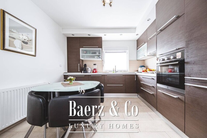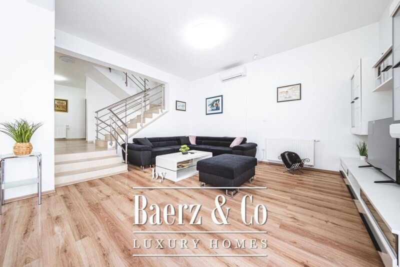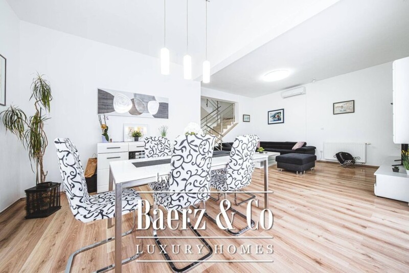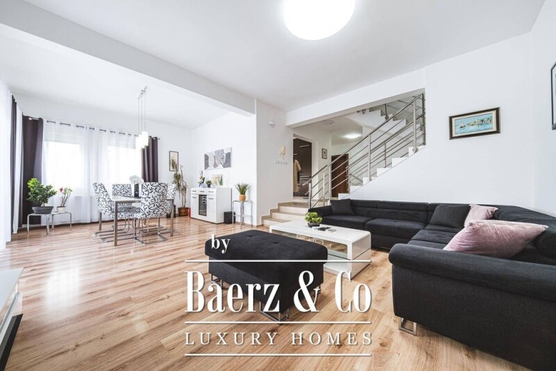 Zagreb, Mikulići, detached house of 380m2 on 3 above-ground floors with big garden. The first floor consists of a living room, kitchen, a bathroom, and two rooms with access to the garden. It is currently used as a separate residential unit for daily rental with separate entrance. The second floor has access through the main door of the house and the garage (40m2 for two cars). It consists of a hallway, a toilet, a storage room, a kitchen with a dining room, a large living room and a terrace of 55 m2 with a beautiful open view. The third floor consists of three bedrooms (master and two children's rooms), a bathroom, and two large terraces. Underfloor heating extends through all three floors where there are tiles. The villa provides privacy with a beautiful view of the city in an exceptionally quiet environment in the immediate vicinity of the city center. Other information on request.