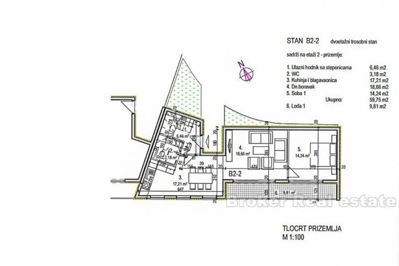 Podstrana, for sale is an attractive two-storey three bedroom apartment with sea view. This beautiful apartment is part of a residential project of smaller houses in a row. Each apartment is like a small house on two floors. The apartment consists of ground floor and first floor and both are connected by an internal staircase. On the ground floor there is an entrance with a staircase, a bathroom, a kitchen with a dining room, a living room, a bedroom and a loggia. On the first floor there is a bathroom, two bedrooms and a glazed terrace as a luxury living room with a glass roof. There is a lot of investment in the equipment of the apartment, so the apartment is really quality real estate comfortable for living in a slightly isolated location. In front of the apartment there are two covered parking spaces.